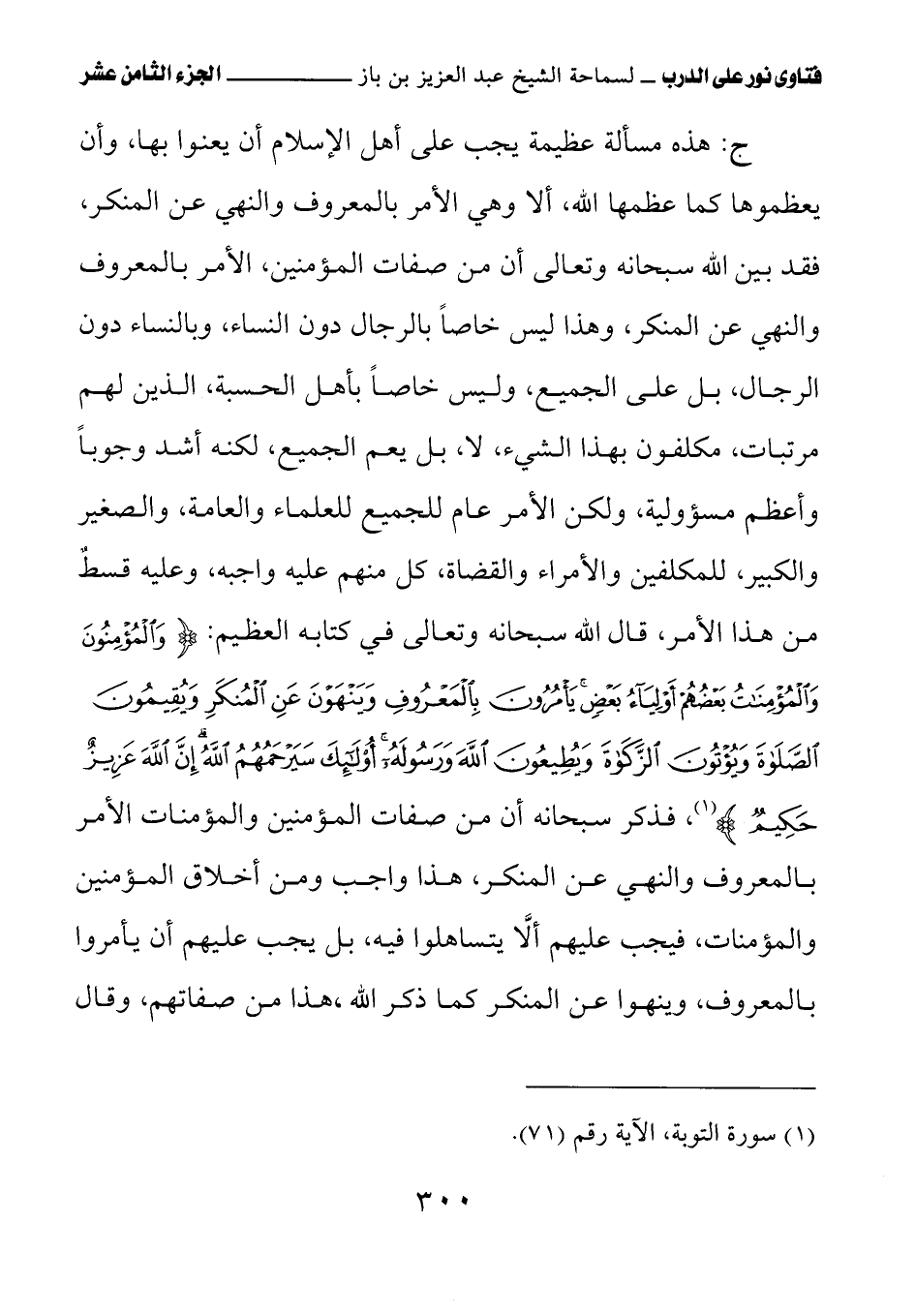 ج: هذه مسألة عظيمة يجب على أهل الإسلام أن يعنوا بها، وأن يعظموها كما عظمها الله، ألا وهي الأمر بالمعروف والنهي عن المنكر، فقد بين الله سبحانه وتعالى أن من صفات المؤمنين، الأمر بالمعروف والنهي عن المنكر، وهذا ليس خاصًا بالرجال دون النساء، وبالنساء دون الرجال، بل على الجميع، وليس خاصًا بأهل الحسبة، الذين لهم مرتبات، مكلفون بهذا الشيء، لا، بل يعم الجميع، لكنه أشد وجوبًا وأعظم مسؤولية، ولكن الأمر عام للجميع للعلماء والعامة، والصغير والكبير، للمكلفين والأمراء والقضاة، كل منهم عليه واجبه، وعليه قسطٌ من هذا الأمر، قال الله سبحانه وتعالى في كتابه العظيم: {وَالْمُؤْمِنُونَ وَالْمُؤْمِنَاتُ بَعْضُهُمْ أَوْلِيَاءُ بَعْضٍ يَأْمُرُونَ بِالْمَعْرُوفِ وَيَنْهَوْنَ عَنِ الْمُنْكَرِ وَيُقِيمُونَ الصَّلاَةَ وَيُؤْتُونَ الزَّكَاةَ وَيُطِيعُونَ اللَّهَ وَرَسُولَهُ أُولَئِكَ سَيَرْحَمُهُمُ اللَّهُ إِنَّ اللَّهَ عَزِيزٌ حَكِيمٌ}، فذكر سبحانه أن من صفات المؤمنين والمؤمنات الأمر بالمعروف والنهي عن المنكر، هذا واجب ومن أخلاق المؤمنين والمؤمنات، فيجب عليهم ألاَّ يتساهلوا فيه، بل يجب عليهم أن يأمروا بالمعروف، وينهوا عن المنكر كما ذكر الله، هذا من صفاتهم، وقال