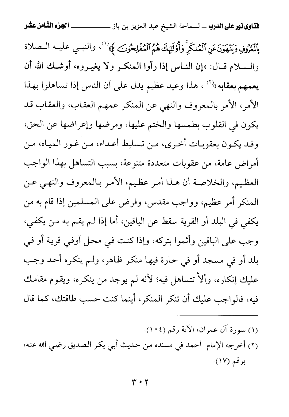 {وَلْتَكُنْ مِنْكُمْ أُمَّةٌ يَدْعُونَ إِلَى الْخَيْرِ وَيَأْمُرُونَ بِالْمَعْرُوفِ وَيَنْهَوْنَ عَنِ الْمُنْكَرِ وَأُولَئِكَ هُمُ الْمُفْلِحُونَ} والنبي عليه الصلاة والسلام قال: «إن الناس إذا رأوا المنكر ولا يغيروه، أوشك الله أن يعمهم بعقابه» (¬1) هذا وعيد عظيم يدل على أن الناس إذا تساهلوا بهذا الأمر، الأمر بالمعروف والنهي عن المنكر عمهم العقاب، والعقاب قد يكون في القلوب بطمسها والختم عليها، ومرضها وإعراضها عن الحق، وقد يكون بعقوبات أخرى، من تسليط أعداء، من غور المياه، من أمراض عامة، من عقوبات متعددة متنوعة، بسبب التساهل بهذا الواجب العظيم، والخلاصة أن هذا أمر عظيم، الأمر بالمعروف والنهي عن المنكر أمر عظيم، وواجب مقدس، وفرض على المسلمين إذا قام به من يكفي في البلد أو القرية سقط عن الباقين، أما إذا لم يقم به من يكفي، وجب على الباقين وأثموا بتركه، وإذا كنت في محل أو في قرية أو في بلد أو في مسجد أو في حارة فيها منكر ظاهر، ولم ينكره أحد وجب عليك إنكاره، وألاَّ تتساهل فيه؛ لأنه لم يوجد من ينكره، ويقوم مقامك فيه، فالواجب عليك أن تنكر المنكر، أينما كنت حسب طاقتك، كما قال
