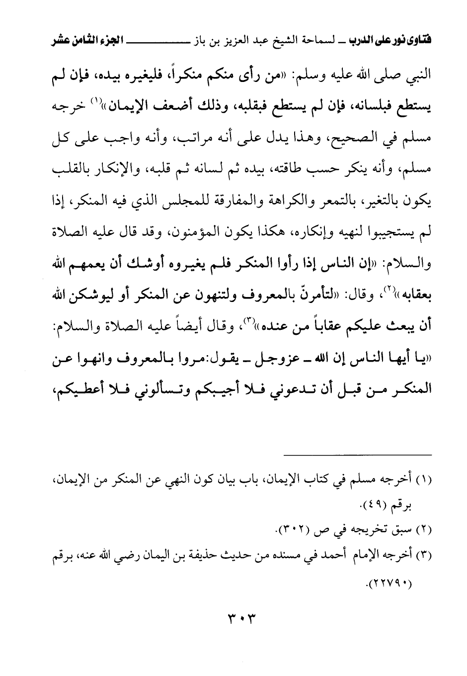 النبي صلى الله عليه وسلم: «من رأى منكم منكرًا، فليغيره بيده، فإن لم يستطع فبلسانه، فإن لم يستطع فبقلبه، وذلك أضعف الإيمان» (¬1) خرجه مسلم في الصحيح، وهذا يدل على أنه مراتب، وأنه واجب على كل مسلم، وأنه ينكر حسب طاقته، بيده ثم لسانه ثم قلبه، والإنكار بالقلب يكون بالتغير، بالتمعر والكراهة والمفارقة للمجلس الذي فيه المنكر، إذا لم يستجيبوا لنهيه وإنكاره، هكذا يكون المؤمنون، وقد قال عليه الصلاة والسلام: «إن الناس إذا رأوا المنكر فلم يغيروه أوشك أن يعمهم الله بعقابه» (¬2) وقال: «لتأمرنّ بالمعروف ولتنهون عن المنكر أو ليوشكن الله أن يبعث عليكم عقابًا من عنده» (¬3) وقال أيضًا عليه الصلاة والسلام: «يا أيها الناس إن الله - عز وجل - يقول: مروا بالمعروف وانهوا عن المنكر من قبل أن تدعوني فلا أجيبكم وتسألوني فلا أعطيكم،