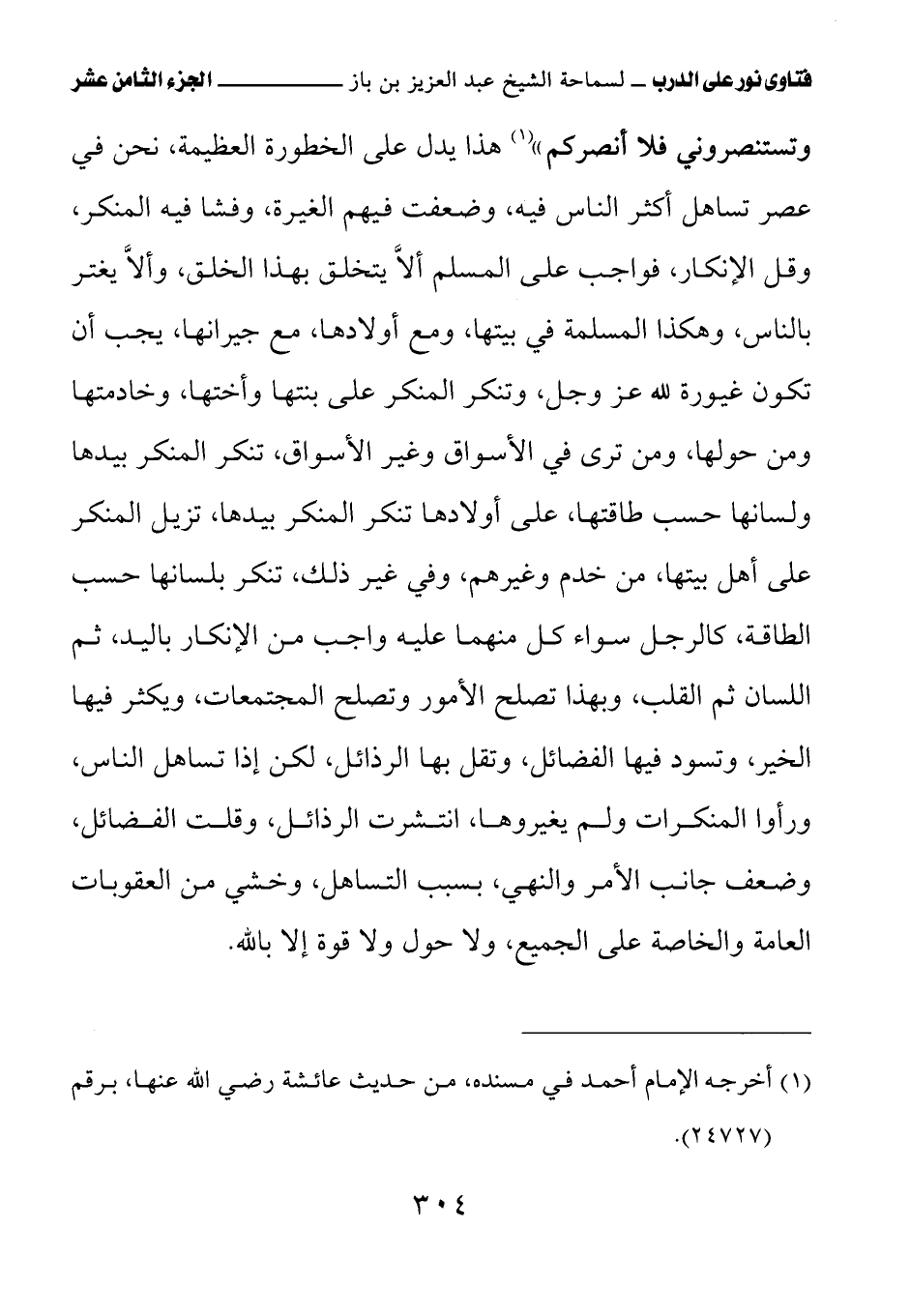 وتستنصروني فلا أنصركم» (¬1) هذا يدل على الخطورة العظيمة، نحن في عصر تساهل أكثر الناس فيه، وضعفت فيهم الغيرة، وفشا فيه المنكر، وقل الإنكار، فواجب على المسلم ألاَّ يتخلق بهذا الخلق، وألاَّ يغتر بالناس، وهكذا المسلمة في بيتها، ومع أولادها، مع جيرانها، يجب أن تكون غيورة لله عز وجل، وتنكر المنكر على بنتها وأختها، وخادمتها ومن حولها، ومن ترى في الأسواق وغير الأسواق، تنكر المنكر بيدها ولسانها حسب طاقتها، على أولادها تنكر المنكر بيدها، تزيل المنكر على أهل بيتها، من خدم وغيرهم، وفي غير ذلك، تنكر بلسانها حسب الطاقة، كالرجل سواء كل منهما عليه واجب من الإنكار باليد، ثم اللسان ثم القلب، وبهذا تصلح الأمور وتصلح المجتمعات، ويكثر فيها الخير، وتسود فيها الفضائل، وتقل بها الرذائل، لكن إذا تساهل الناس، ورأوا المنكرات ولم يغيروها، انتشرت الرذائل، وقلت الفضائل، وضعف جانب الأمر والنهي، بسبب التساهل، وخشي من العقوبات العامة والخاصة على الجميع، ولا حول ولا قوة إلا بالله.
