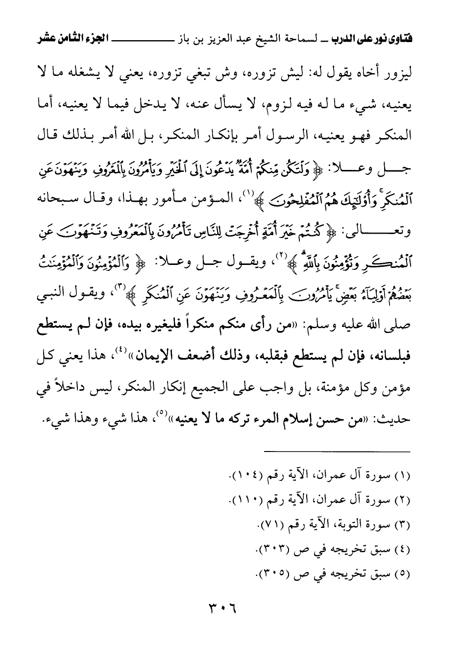 ليزور أخاه يقول له: ليش تزوره، وش تبغي تزوره، يعني لا يشغله ما لا يعنيه، شيء ما له فيه لزوم، لا يسأل عنه، لا يدخل فيما لا يعنيه، أما المنكر فهو يعنيه، الرسول أمر بإنكار المنكر، بل الله أمر بذلك قال جل وعلا: {وَلْتَكُنْ مِنْكُمْ أُمَّةٌ يَدْعُونَ إِلَى الْخَيْرِ وَيَأْمُرُونَ بِالْمَعْرُوفِ وَيَنْهَوْنَ عَنِ الْمُنْكَرِ وَأُولَئِكَ هُمُ الْمُفْلِحُونَ}، المؤمن مأمور بهذا، وقال سبحانه وتعالى: {كُنْتُمْ خَيْرَ أُمَّةٍ أُخْرِجَتْ لِلنَّاسِ تَأْمُرُونَ بِالْمَعْرُوفِ وَتَنْهَوْنَ عَنِ الْمُنْكَرِ وَتُؤْمِنُونَ بِاللَّهِ}، ويقول جل وعلا: {وَالْمُؤْمِنُونَ وَالْمُؤْمِنَاتُ بَعْضُهُمْ أَوْلِيَاءُ بَعْضٍ يَأْمُرُونَ بِالْمَعْرُوفِ وَيَنْهَوْنَ عَنِ الْمُنْكَرِ}، ويقول النبي صلى الله عليه وسلم: «من رأى منكم منكرا فليغيره بيده، فإن لم يستطع فبلسانه، فإنه لم يستطع فبقلبه، وذلك أضعف الإيمان» (¬1) هذا بعني كل مؤمن وكل مؤمنة، بل واجب على الجميع إنكار المنكر، ليس داخلاً في حديث: «من حسن إسلام المرء تركه ما لا يعنيه» (¬2) هذا شيء وهذا شيء.