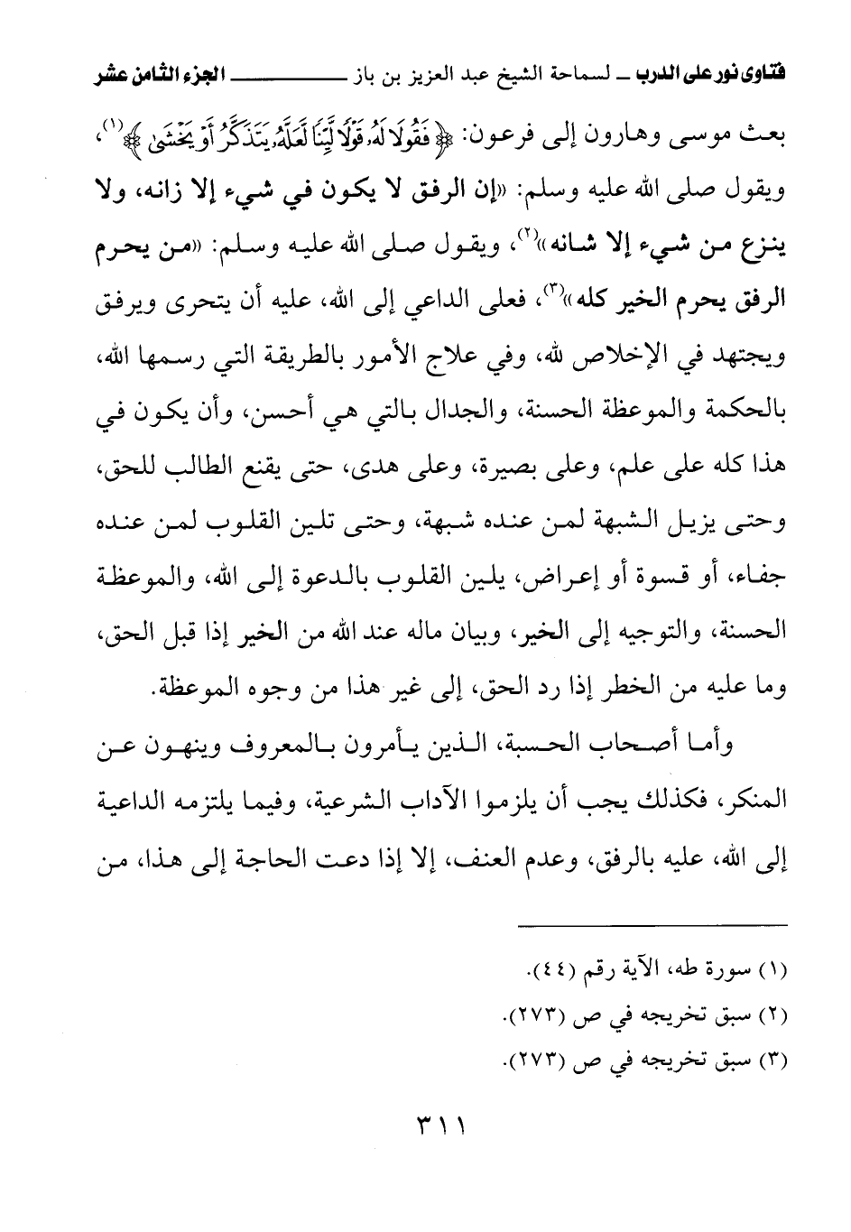 بعث موسى وهارون إلى فرعون: {فَقُولاَ لَهُ قَوْلاً لَيِّنًا لَعَلَّهُ يَتَذَكَّرُ أَوْ يَخْشَى}، ويقول صلى الله عليه وسلم: «إن الرفق لا يكون في شيء إلا زانه، ولا ينزع من شيء إلا شانه» (¬1) ويقول صلى الله عليه وسلم: «من يحرم الرفق يحرم الخير كله» (¬2) فعلى الداعي إلى الله، عليه أن يتحرى ويرفق ويجتهد في الإخلاص لله، وفي علاج الأمور بالطريقة التي رسمها الله، بالحكمة والموعظة الحسنة، والجدال بالتي هي أحسن، وأن يكون في هذا كله على علم، وعلى بصيرة، وعلى هدى، حتى يقنع الطالب للحق، وحتى يزيل الشبهة لمن عنده شبهة، وحتى تلين القلوب لمن عنده جفاء، أو قسوة أو إعراض، يلين القلوب بالدعوة إلى الله، والموعظة الحسنة، والتوجيه إلى الخير، وبيان ما له عند الله من الخير إذا قبل الحق، وما عليه من الخطر إذا رد الحق، إلى غير هذا من وجوه الموعظة.