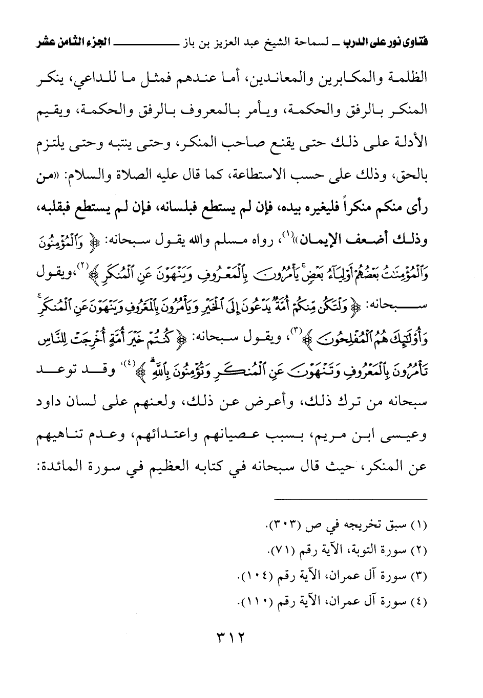 الظلمة والمكابرين والمعاندين، أما عندهم فمثل ما للداعي، ينكر المنكر بالرفق والحكمة، ويأمر بالمعروف بالرفق والحكمة، ويقيم الأدلة على ذلك حتى يقنع صاحب المنكر، وحتى ينتبه وحتى يلتزم بالحق، وذلك على حسب الاستطاعة، كما قال عليه الصلاة والسلام: «من رأى منكم منكرا فليغيره بيده، فإن لم يستطع فبلسانه، فإن لم يستطع فبقلبه، وذلك أضعف الإيمان» (¬1) رواه مسلم والله يقول سبحانه: {وَالْمُؤْمِنُونَ وَالْمُؤْمِنَاتُ بَعْضُهُمْ أَوْلِيَاءُ بَعْضٍ يَأْمُرُونَ بِالْمَعْرُوفِ وَيَنْهَوْنَ عَنِ الْمُنْكَرِ}، ويقول سبحانه: {وَلْتَكُنْ مِنْكُمْ أُمَّةٌ يَدْعُونَ إِلَى الْخَيْرِ وَيَأْمُرُونَ بِالْمَعْرُوفِ وَيَنْهَوْنَ عَنِ الْمُنْكَرِ وَأُولَئِكَ هُمُ الْمُفْلِحُونَ} ويقول سبحانه: {كُنْتُمْ خَيْرَ أُمَّةٍ أُخْرِجَتْ لِلنَّاسِ تَأْمُرُونَ بِالْمَعْرُوفِ وَتَنْهَوْنَ عَنِ الْمُنْكَرِ وَتُؤْمِنُونَ بِاللَّهِ} وقد توعد سبحانه من ترك ذلك، وأعرض عن ذلك، ولعنهم على لسان داود وعيسى ابن مريم، بسبب عصيانهم واعتدائهم، وعدم تناهيهم عن المنكر، حيث قال سبحانه في كتابه العظيم في سورة المائدة: