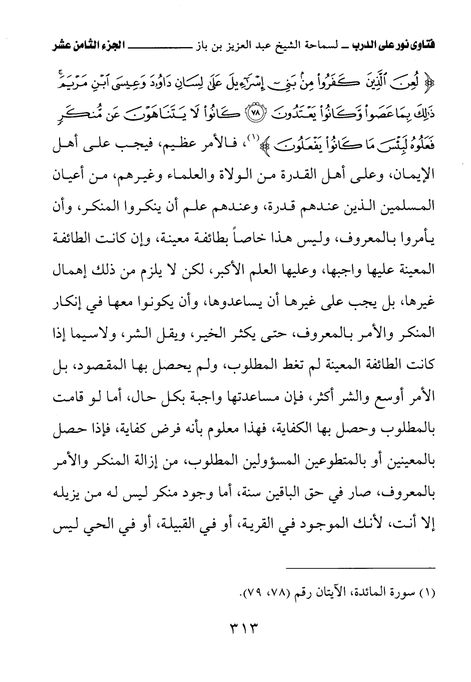 {لُعِنَ الَّذِينَ كَفَرُوا مِنْ بَنِي إِسْرَائِيلَ عَلَى لِسَانِ دَاوُدَ وَعِيسَى ابْنِ مَرْيَمَ ذَلِكَ بِمَا عَصَوْا وَكَانُوا يَعْتَدُونَ (78) كَانُوا لاَ يَتَنَاهَوْنَ عَنْ مُنْكَرٍ فَعَلُوهُ لَبِئْسَ مَا كَانُوا يَفْعَلُونَ}، فالأمر عظيم، فيجب على أهل الإيمان، وعلى أهل القدرة من الولاة والعلماء وغيرهم، من أعيان المسلمين الذين عندهم قدرة، وعندهم علم أن ينكروا المنكر، وأن يأمروا بالمعروف، وليس هذا خاصًا بطائفة معينة، وإن كانت الطائفة المعينة عليها واجبها، وعليها العلم الأكبر، لكن لا يلزم من ذلك إهمال غيرها، بل يجب على غيرها أن يساعدوها، وأن يكونوا معها في إنكار المنكر والأمر بالمعروف، حتى يكثر الخير، ويقل الشر، ولا سيما إذا كانت الطائفة المعينة لم تغط المطلوب، ولم يحصل بها المقصود، بل الأمر أوسع والشر أكثر، فإن مساعدتها واجبة بكل حال، أما لو قامت بالمطلوب وحصل بها الكفاية، فهذا معلوم بأنه فرض كفاية، فإذا حصل بالمعينين أو بالمتطوعين المسؤولين المطلوب، من إزالة المنكر والأمر بالمعروف، صار في حق الباقين سنة، أما وجود منكر ليس له من يزيله إلا أنت، لأنك الموجود في القرية، أو في القبيلة، أو في الحي ليس