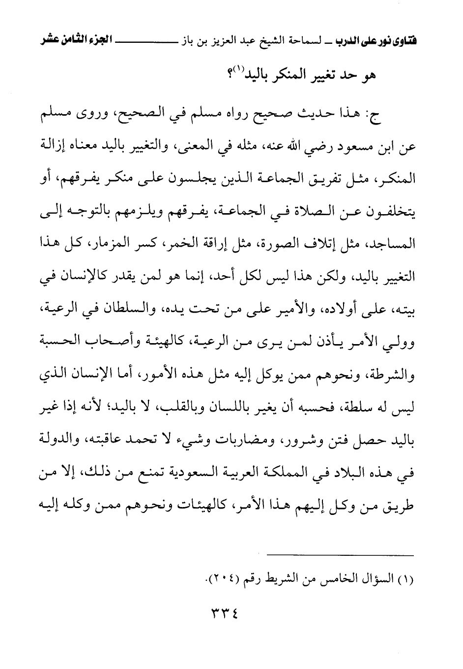 ج: هذا حديث صحيح رواه مسلم في الصحيح، وروى مسلم عن ابن مسعود رضي الله عنه، مثله في المعنى، والتغيير باليد معناه إزالة المنكر، مثل تفريق الجماعة الذين يجلسون على منكر يفرقهم، أو يتخلفون عن الصلاة في الجماعة، يفرقهم ويلزمهم بالتوجه إلى المساجد، مثل إتلاف الصورة، مثل إراقة الخمر، كسر المزمار، كل هذا التغيير باليد، ولكن هذا ليس لكل أحد، إنما هو لمن يقدر كالإنسان في بيته، على أولاده، والأمير على من تحت يده، والسلطان في الرعية، وولي الأمر يأذن لمن يرى من الرعية، كالهيئة وأصحاب الحسبة والشرطة، ونحوهم ممن يوكل إليه مثل هذه الأمور، أما الإنسان الذي ليس له سلطة، فحسبه أن يغير باللسان وبالقلب، لا باليد؛ لأنه إذا غير باليد حصل فتن وشرور، ومضاربات وشيء لا تحمد عاقبته، والدولة في هذه البلاد في المملكة العربية السعودية تمنع من ذلك، إلا من طريق من وكل إليهم هذا الأمر، كالهيئات ونحوهم ممن وكله إليه