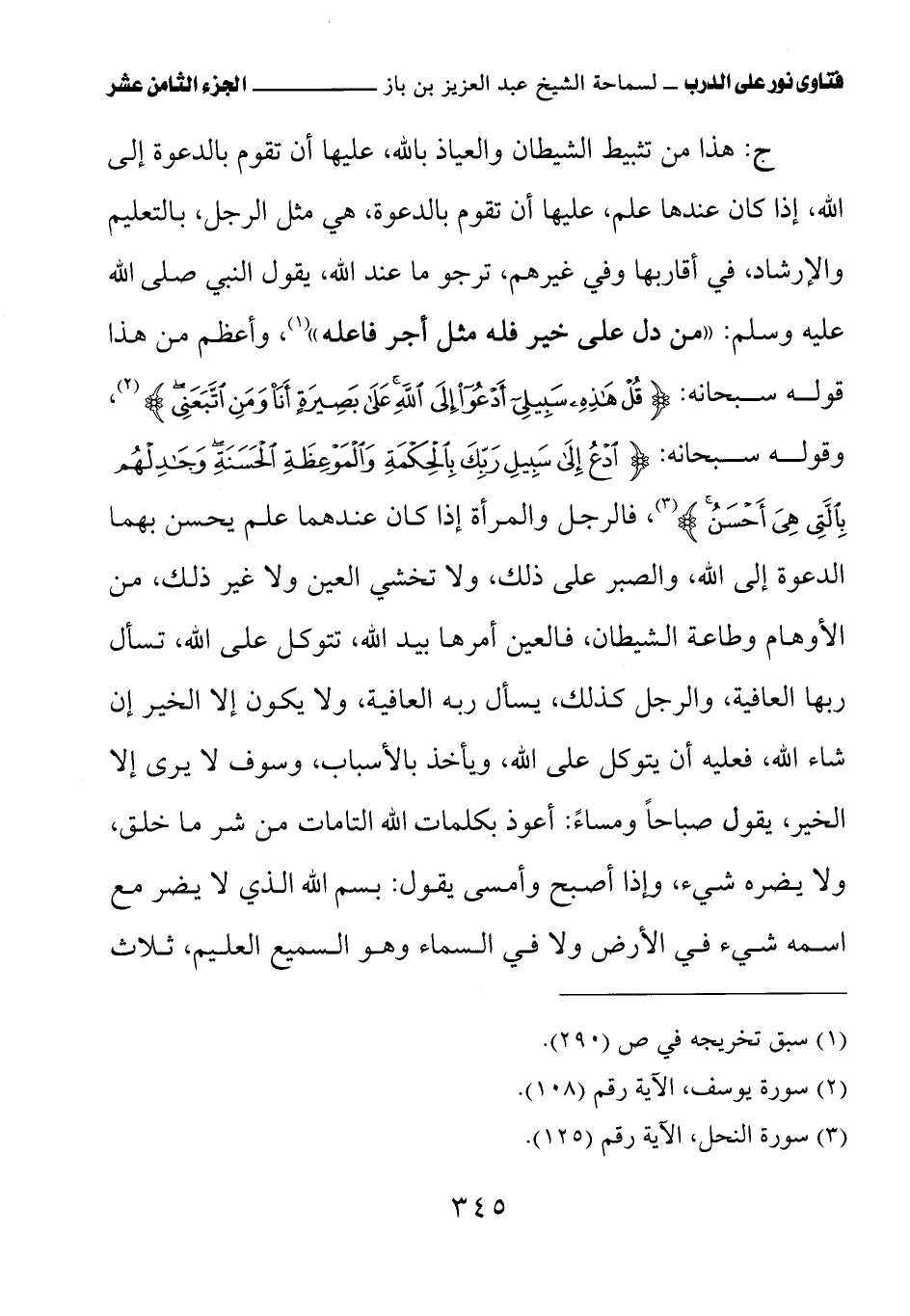 ج: هذا من تثبيط الشيطان والعياذ بالله، عليها أن تقوم بالدعوة إلى الله، إذا كان عندها علم، عليها أن تقوم بالدعوة، هي مثل الرجل، بالتعليم والإرشاد، في أقاربها وفي غيرهم، ترجو ما عند الله، يقول النبي صلى الله عليه وسلم: «من دل على خير فله مثل أجر فاعله» (¬1) وأعظم من هذا قوله سبحانه: {قُلْ هَذِهِ سَبِيلِي أَدْعُو إِلَى اللَّهِ عَلَى بَصِيرَةٍ أَنَا وَمَنِ اتَّبَعَنِي}، وقوله سبحانه: {ادْعُ إِلَى سَبِيلِ رَبِّكَ بِالْحِكْمَةِ وَالْمَوْعِظَةِ الْحَسَنَةِ وَجَادِلْهُمْ بِالَّتِي هِيَ أَحْسَنُ}، فالرجل والمرأة إذا كان عندهما علم يحسن بهما الدعوة إلى الله، والصبر على ذلك، ولا تخشى العين ولا غير ذلك، من الأوهام وطاعة الشيطان، فالعين أمرها بيد الله، تتوكل على الله، تسأل ربها العافية، والرجل كذلك، يسأل ربه العافية، ولا يكون إلا الخير إن شاء الله، فعليه أن يتوكل على الله، ويأخذ بالأسباب، وسوف لا يرى إلا الخير، يقول صباحًا ومساءً: أعوذ بكلمات الله التامات من شر ما خلق، ولا يضره شيء، وإذا أصبح وأمسى يقول: بسم الله الذي لا يضر مع اسمه شيء في الأرض ولا في السماء وهو السميع العليم، ثلاث