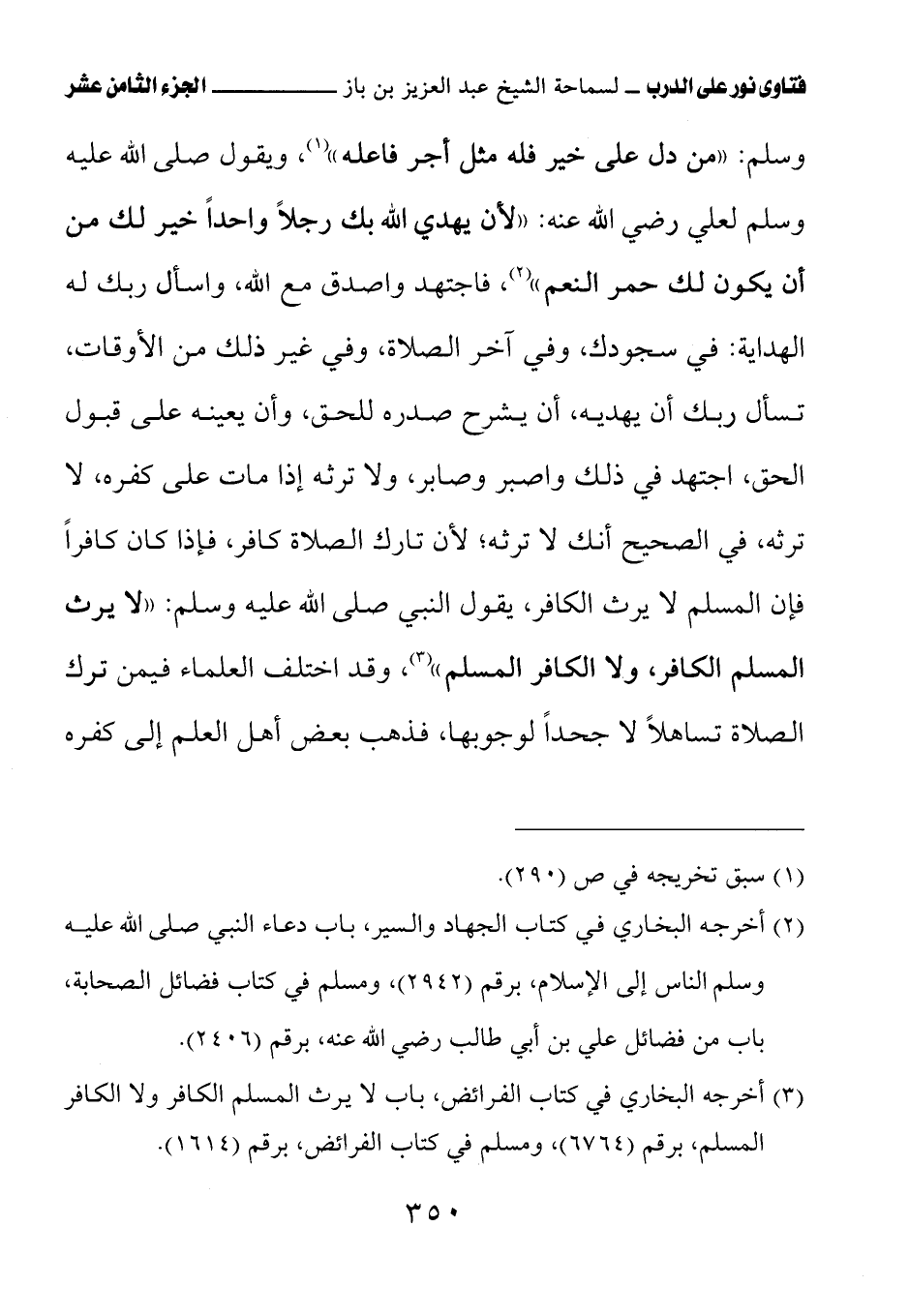وسلم: «من دل على خير فله مثل أجر فاعله» (¬1) ويقول صلى الله عليه وسلم لعلي رضي الله عنه: «لأن يهدي الله بك رجلاً واحدًا خير لك من أن يكون لك حمر النعم» (¬2) فاجتهد واصدق مع الله، واسأل ربك له الهداية: في سجودك، وفي آخر الصلاة، وفي غير ذلك من الأوقات، تسأل ربك أن يهديه، أن يشرح صدره للحق، وأن يعينه على قبول الحق، اجتهد في ذلك واصبر وصابر، ولا ترثه إذا مات على كفره، لا ترثه، في الصحيح أنك لا ترثه؛ لأن تارك الصلاة كافر، فإذا كان كافرًا فإن المسلم لا يرث الكافر، يقول صلى الله عليه وسلم: «لا يرث المسلم الكافر، ولا الكافر المسلم» (¬3) وقد اختلف العلماء فيمن ترك الصلاة تساهلاً لا جحدًا لوجوبها، فذهب بعض أهل العلم إلى كفره
