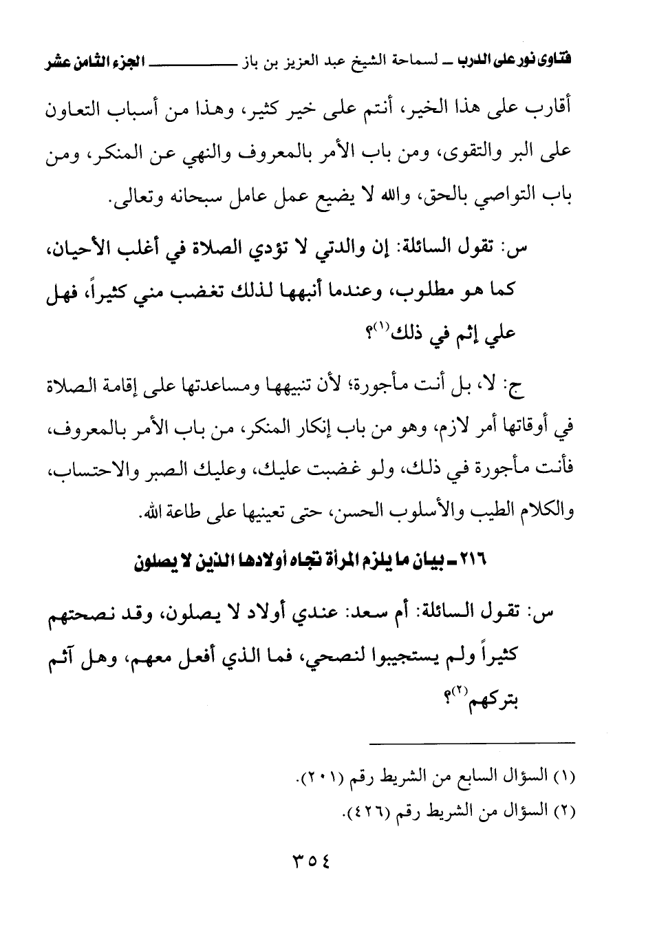 216 - بيان ما يلزم المرأة تجاه أولادها الذين لا يصلون
