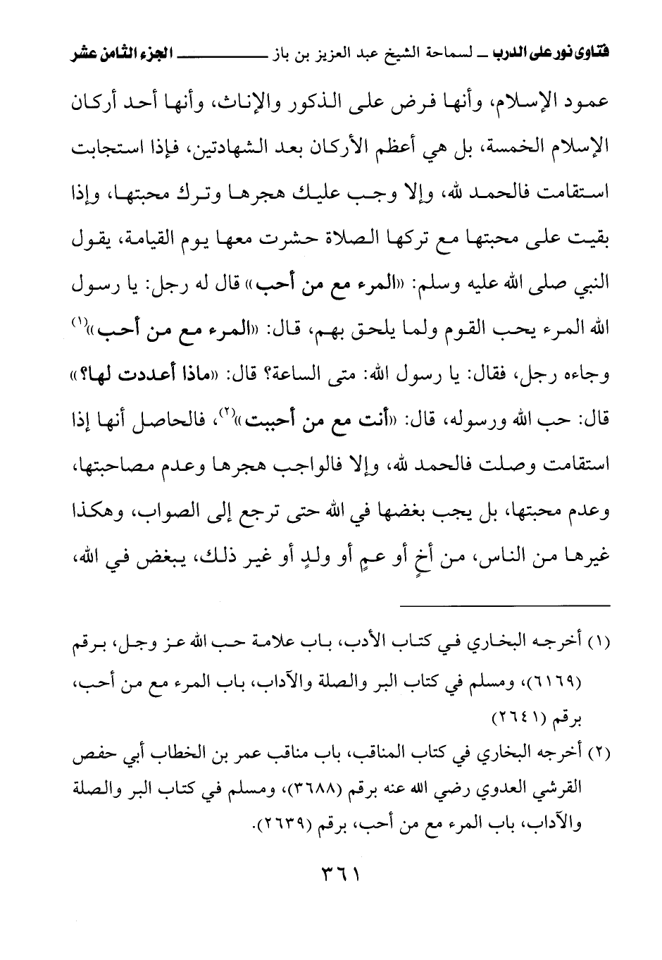 عمود الإسلام، وأنها فرض على الذكور والإناث، وأنها أحد أركان الإسلام الخمسة، بل هي أعظم الأركان بعد الشهادتين، فإذا استجابت استقامت فالحمد لله، وإلا وجب عليك هجرها وترك محبتها، وإذا بقيت على محبتها مع تركها الصلاة حشرت معها يوم القيامة، يقول النبي صلى الله عليه وسلم: «المرء مع من أحب قال له رجل: يا رسول الله المرء يحب القوم ولما يلحق بهم، قال: المرء مع من أحب» (¬1) وجاءه رجل، فقال: «يا رسول الله: متى الساعة؟ قال: ماذا أعددت لها؟ قال: حب الله ورسوله، قال: أنت مع من أحببت» (¬2) فالحاصل أنها إذا استقامت وصلت فالحمد لله، وإلا فالواجب هجرها وعدم مصاحبتها، وعدم محبتها، بل يجب بغضها في الله حتى ترجع إلى الصواب، وهكذا غيرها من الناس، من أخٍ أو عمٍ أو ولدٍ أو غير ذلك، يبغض في الله،