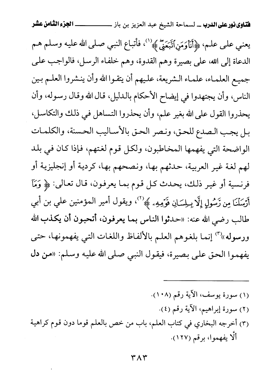 يعني على علم، {أَنَا وَمَنِ اتَّبَعَنِي}، فأتباع النبي صلى الله عليه وسلم هم الدعاة إلى الله، على بصيرة وهم القدوة، وهم خلفاء الرسل، فالواجب على جميع العلماء، علماء الشريعة، عليهم أن يتقوا الله، وأن ينشروا العلم بين الناس، وأن يجتهدوا في إيضاح الأحكام بالدليل، قال الله وقال رسوله، وأن يحذروا القول على الله بغير علم، وأن يحذروا التساهل في ذلك والتكاسل، بل يجب الصدع للحق، ونصر الحق بالأساليب الحسنة، والكلمات الواضحة التي يفهمها المخاطبون، ولكل قوم لغتهم، فإذا كان في بلد لهم لغة غير العربية، حدثهم بها، ونصحهم بها، كردية أو إنجليزية أو فرنسية أو غير ذلك، يحدث كل قوم بما يعرفون، قال تعالى: {وَمَا أَرْسَلْنَا مِنْ رَسُولٍ إِلاَّ بِلِسَانِ قَوْمِهِ}، ويقول أمير المؤمنين علي بن أبي طالب رضي الله عنه: حدثوا الناس بما يعرفون، أتحبون أن يكذب الله ورسوله إنما بلغوهم العلم بالألفاظ واللغات التي يفهمونها، حتى يفهموا الحق على بصيرة، فيقول النبي صلى الله عليه وسلم: «من دل