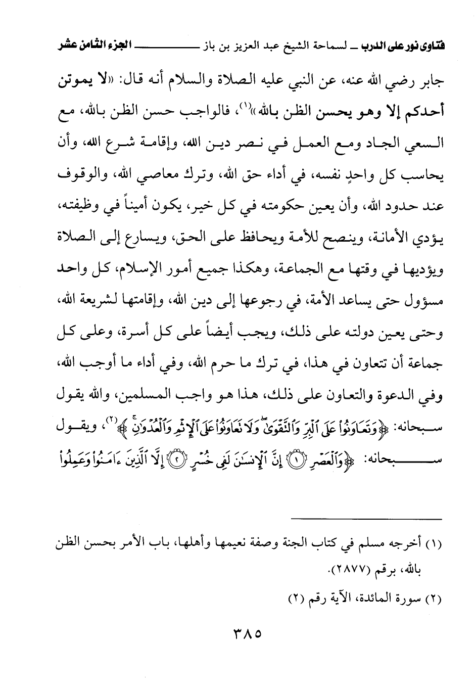 جابر رضي الله عنه، عن النبي عليه الصلاة والسلام أنه قال: «لا يموتن أحدكم إلا وهو يحسن الظن بالله» (¬1) فالواجب حسن الظن بالله، مع السعي الجاد ومع العمل في نصر دين الله، وإقامة شرع الله، وأن يحاسب كل واحد نفسه، في أداء حق الله، وترك معاصي الله، والوقوف عند حدود الله، وأن يعين حكومته في كل خير، يكون أمينًا في وظيفته، يؤدي الأمانة، وينصح للأمة ويحافظ على الحق، ويسارع إلى الصلاة ويؤديها في وقتها مع الجماعة، وهكذا جميع أمور الإسلام، كل واحد مسؤول حتى يساعد الأمة، في رجوعها إلى دين الله، وإقامتها لشريعة الله، وحتى يعين دولته على ذلك، ويجب أيضًا على كل أسرة، وعلى كل جماعة أن تتعاون في هذا، في ترك ما حرم الله، وفي أداء ما أوجب الله، وفي الدعوة والتعاون على ذلك، هذا هو واجب المسلمين، والله يقول سبحانه: {وَتَعَاوَنُوا عَلَى الْبِرِّ وَالتَّقْوَى وَلاَ تَعَاوَنُوا عَلَى الْإِثْمِ وَالْعُدْوَانِ}، ويقول سبحانه: {وَالْعَصْرِ (1) إِنَّ الْإِنْسَانَ لَفِي خُسْرٍ (2) إِلاَّ الَّذِينَ آمَنُوا وَعَمِلُوا الصَّالِحَاتِ وَتَوَاصَوْا بِالْحَقِّ وَتَوَاصَوْا بِالصَّبْرِ}،