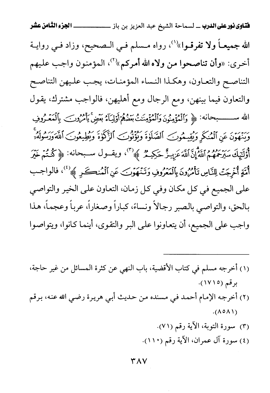 الله جميعًا ولا تفرقوا» (¬1) رواه مسلم في الصحيح، وزاد في رواية أخرى: «وأن تناصحوا من ولاه الله أمركم» (¬2) المؤمنون واجب عليهم التناصح والتعاون، وهكذا النساء المؤمنات، يجب عليهن التناصح والتعاون فيما بينهن، ومع الرجال ومع أهليهن، فالواجب مشترك، يقول الله سبحانه: {وَالْمُؤْمِنُونَ وَالْمُؤْمِنَاتُ بَعْضُهُمْ أَوْلِيَاءُ بَعْضٍ يَأْمُرُونَ بِالْمَعْرُوفِ وَيَنْهَوْنَ عَنِ الْمُنْكَرِ وَيُقِيمُونَ الصَّلاَةَ وَيُؤْتُونَ الزَّكَاةَ وَيُطِيعُونَ اللَّهَ وَرَسُولَهُ أُولَئِكَ سَيَرْحَمُهُمُ اللَّهُ إِنَّ اللَّهَ عَزِيزٌ حَكِيمٌ}، ويقول سبحانه: {كُنْتُمْ خَيْرَ أُمَّةٍ أُخْرِجَتْ لِلنَّاسِ تَأْمُرُونَ بِالْمَعْرُوفِ وَتَنْهَوْنَ عَنِ الْمُنْكَرِ}، فالواجب على الجميع في كل مكان وفي كل زمان، التعاون على الخير والتواصي بالحق، والتواصي بالصبر رجالاً ونساءً، كبارًا وصغارًا، عربًا وعجمًا، هذا واجب على الجميع، أن يتعاونوا على البر والتقوى أينما كانوا، ويتواصوا