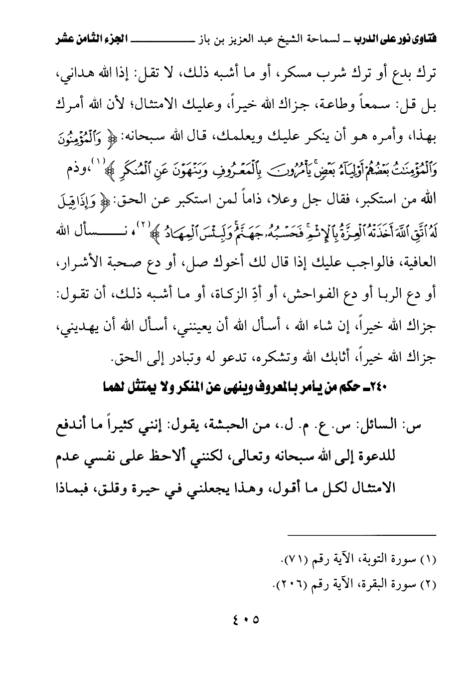 ترك بدع أو ترك شرب مسكر، أو ما أشبه ذلك، لا تقل: إذا الله هداني، بل قل: سمعًا وطاعة، جزاك الله خيرًا، وعليك الامتثال؛ لأن الله أمرك بهذا، وأمره هو أن ينكر عليك ويعلمك، قال الله سبحانه: {وَالْمُؤْمِنُونَ وَالْمُؤْمِنَاتُ بَعْضُهُمْ أَوْلِيَاءُ بَعْضٍ يَأْمُرُونَ بِالْمَعْرُوفِ وَيَنْهَوْنَ عَنِ الْمُنْكَرِ} وذم الله من استكبر، فقال جل وعلا، ذامًا لمن استكبر عن الحق: {وَإِذَا قِيلَ لَهُ اتَّقِ اللَّهَ أَخَذَتْهُ الْعِزَّةُ بِالْإِثْمِ فَحَسْبُهُ جَهَنَّمُ وَلَبِئْسَ الْمِهَادُ} نسأل الله العافية، فالواجب عليك إذا قال لك أخوك صل، أو دع صحبة الأشرار، أو دع الربا أو دع الفواحش، أو أدِّ الزكاة، أو ما أشبه ذلك، أن تقول: جزاك الله خيرًا، إن شاء الله، أسال الله أن يعينني، أسأل الله أن يهديني، جزاك الله خيرًا، أثابك الله وتشكره، تدعو له وتبادر إلى الحق.