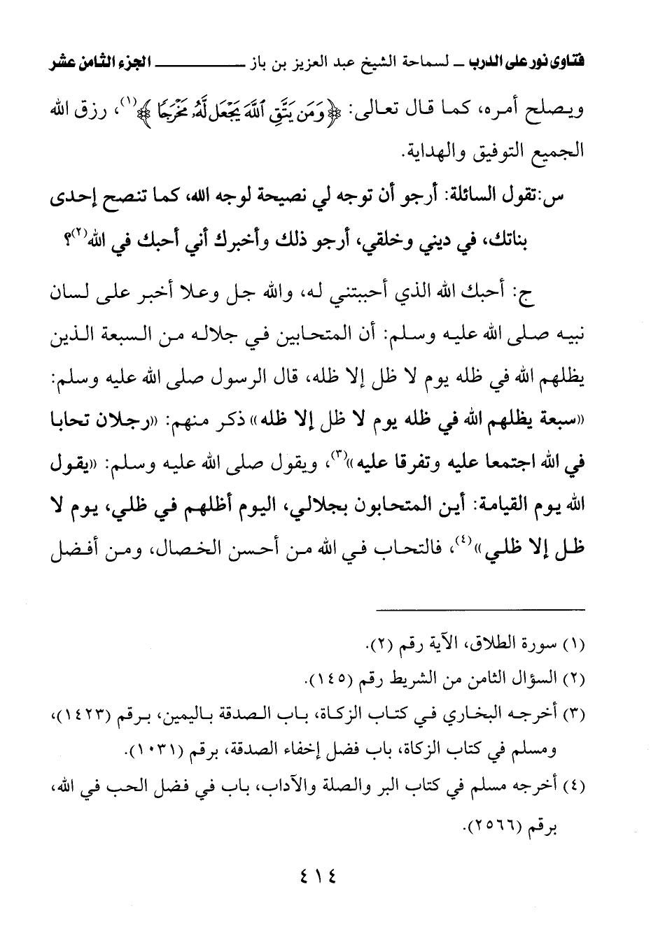 (¬3) أخرجه مسلم في كتاب البر والصلة والآداب، باب في فضل الحب في الله، برقم (2566).