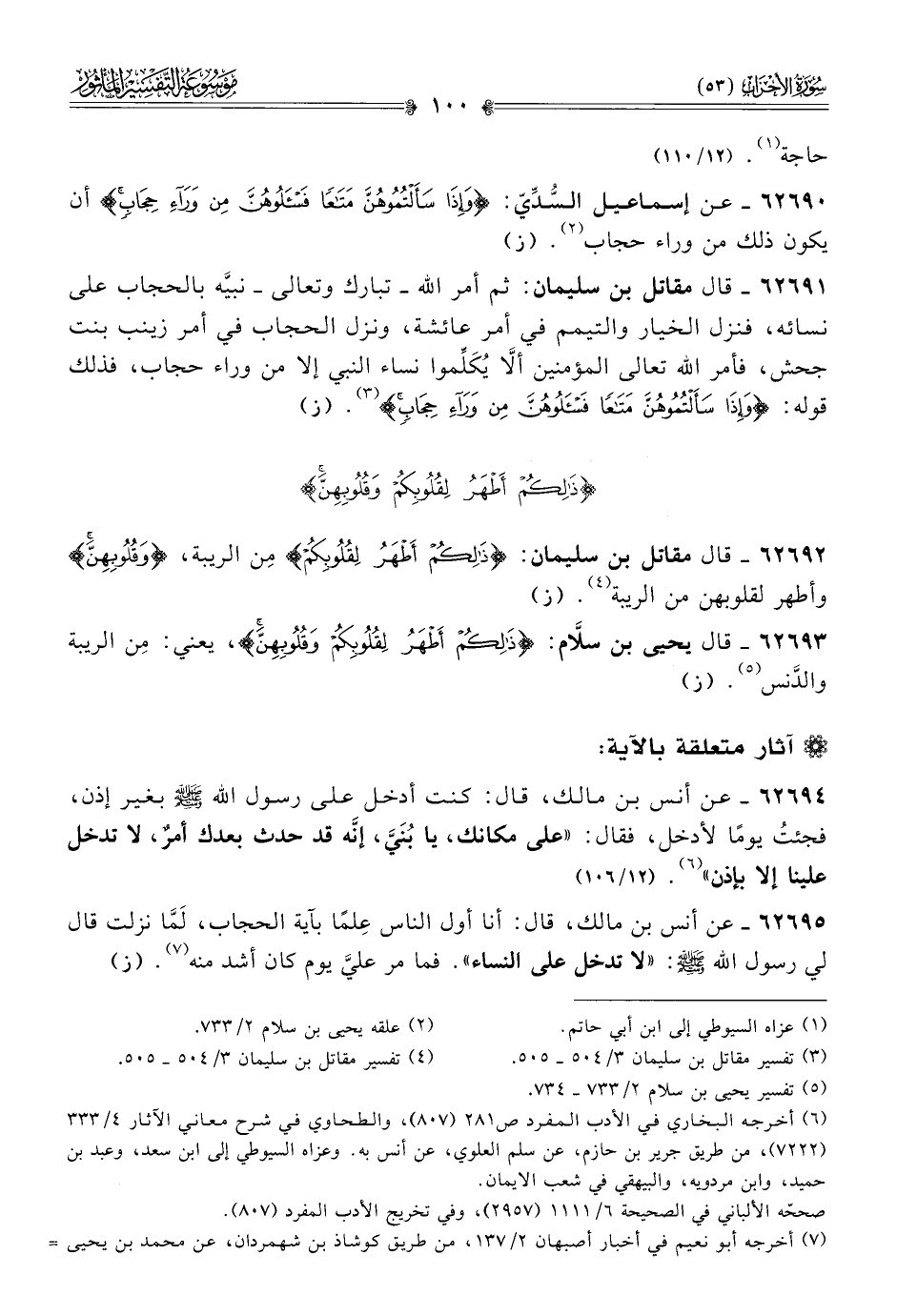 ٦٢٦٩١ - قال مقاتل بن سليمان: ثم أمر الله -تبارك وتعالى- نبيَّه بالحجاب على نسائه، فنزل الخيار والتيمم في أمر عائشة، ونزل الحجاب في أمر زينب بنت جحش، فأمر الله تعالى المؤمنين ألّا يُكَلِّموا نساء النبي إلا من وراء حجاب، فذلك قوله: {وإذا سَأَلْتُمُوهُنَّ مَتاعًا فاسْأَلُوهُنَّ مِن وراءِ حِجابٍ} (¬٣). (ز)