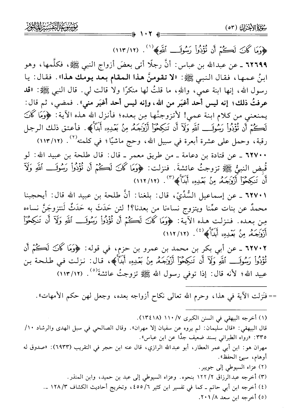 ٦٢٧٠٠ - عن قتادة بن دعامة -من طريق معمر- قال: قال طلحة بن عبيد الله: لو قُبِض النبيُّ - صلى الله عليه وسلم - تزوجتُ عائشةَ. فنزلت: {وما كانَ لَكُمْ أنْ تُؤْذُوا رَسُولَ اللَّهِ ولا أنْ تَنْكِحُوا أزْواجَهُ مِن بَعْدِهِ أبَدًا} (¬٣). (١٢/ ١١٢)