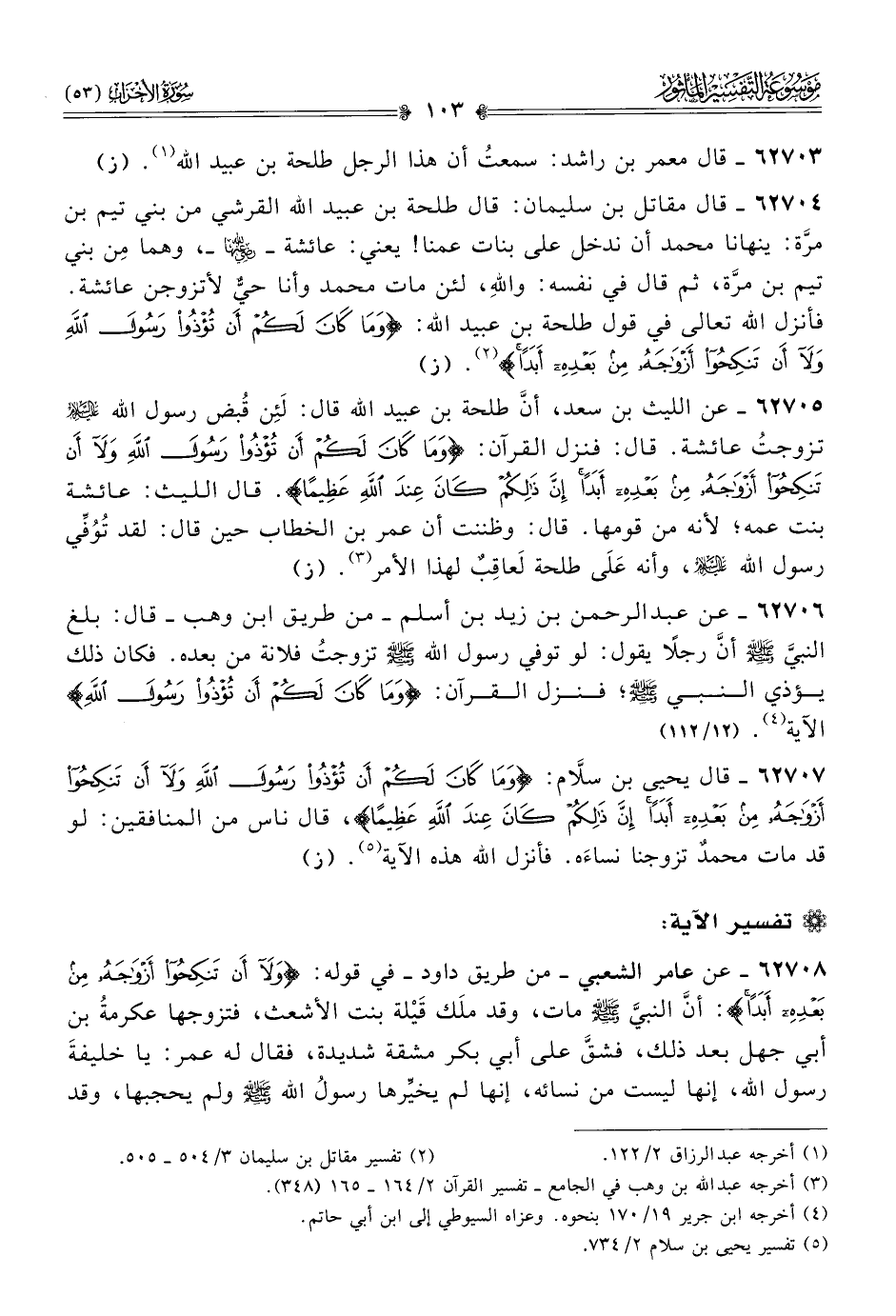 ٦٢٧٠٦ - عن عبد الرحمن بن زيد بن أسلم -من طريق ابن وهب- قال: بلغ النبيَّ - صلى الله عليه وسلم - أنّ رجلًا يقول: لو توفي رسول الله - صلى الله عليه وسلم - تزوجتُ فلانة من بعده. فكان ذلك يؤذي النبي - صلى الله عليه وسلم -؛ فنزل القرآن: {وما كانَ لَكُمْ أنْ تُؤْذُوا رَسُولَ اللَّهِ} الآية (¬٤). (١٢/ ١١٢)
