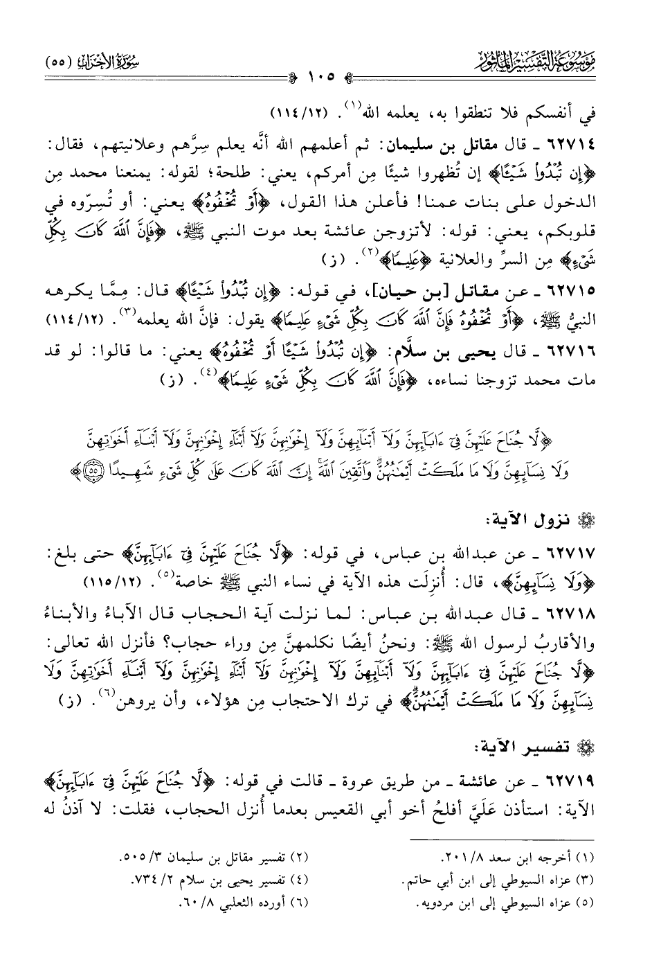 ٦٢٧١٨ - قال عبد الله بن عباس: لما نزلت آية الحجاب قال الآباءُ والأبناءُ والأقاربُ لرسول الله - صلى الله عليه وسلم -: ونحنُ أيضًا نكلمهنَّ مِن وراء حجاب؟ فأنزل الله تعالى: {لا جُناحَ عَلَيْهِنَّ فِي آبائِهِنَّ ولا أبْنائِهِنَّ ولا إخْوانِهِنَّ ولا أبْناءِ إخْوانِهِنَّ ولا أبْناءِ أخَواتِهِنَّ ولا نِسائِهِنَّ ولا ما مَلَكَتْ أيْمانُهُنَّ} في ترك الاحتجاب مِن هؤلاء، وأن يروهن (¬٦). (ز)