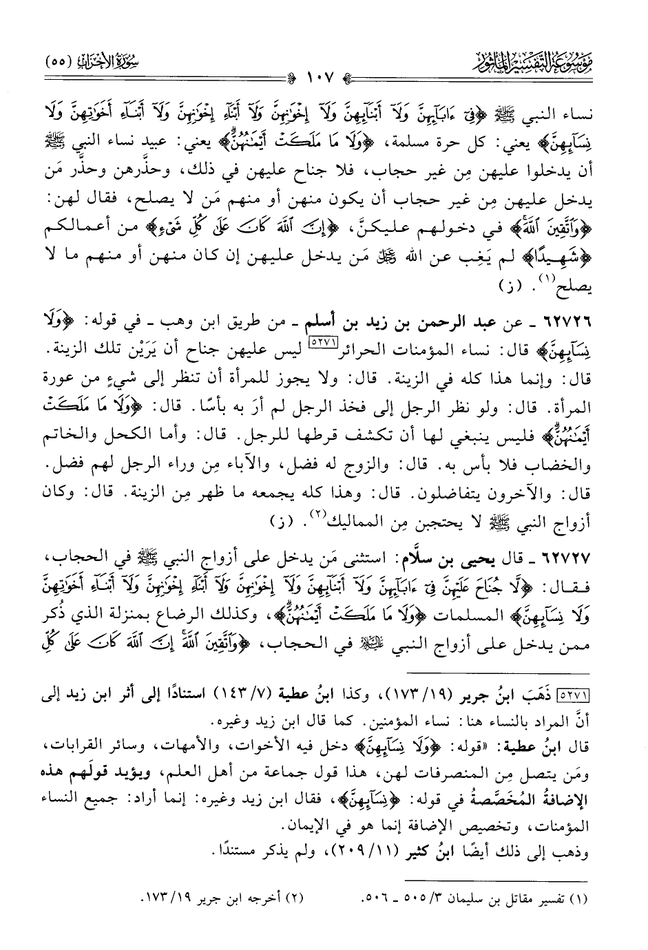 ٦٢٧٢٧ - قال يحيى بن سلّام: استثنى مَن يدخل على أزواج النبي - صلى الله عليه وسلم - في الحجاب، فقال: {لا جُناحَ عَلَيْهِنَّ فِي آبائِهِنَّ ولا أبْنائِهِنَّ ولا إخْوانِهِنَّ ولا أبْناءِ إخْوانِهِنَّ ولا أبْناءِ أخَواتِهِنَّ ولا نِسائِهِنَّ} المسلمات {ولا ما مَلَكَتْ أيْمانُهُنَّ}، وكذلك الرضاع بمنزلة الذي ذُكر ممن يدخل على أزواج النبي - عليه السلام - في الحجاب، {واتَّقِينَ اللَّهَ إنَّ اللَّهَ كانَ عَلى كُلِّ