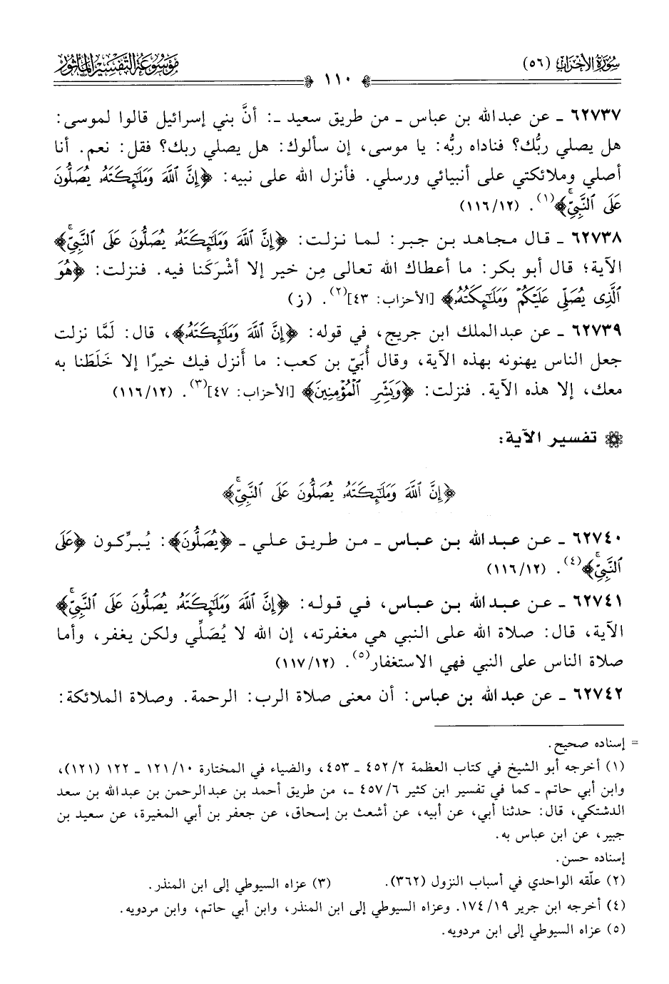 ٦٢٧٣٧ - عن عبد الله بن عباس -من طريق سعيد-: أنّ بني إسرائيل قالوا لموسى: هل يصلي ربُّك؟ فناداه ربُّه: يا موسى، إن سألوك: هل يصلي ربك؟ فقل: نعم. أنا أصلي وملائكتي على أنبيائي ورسلي. فأنزل الله على نبيه: {إنَّ اللَّهَ ومَلائِكَتَهُ يُصَلُّونَ عَلى النبي} (¬١). (١٢/ ١١٦)