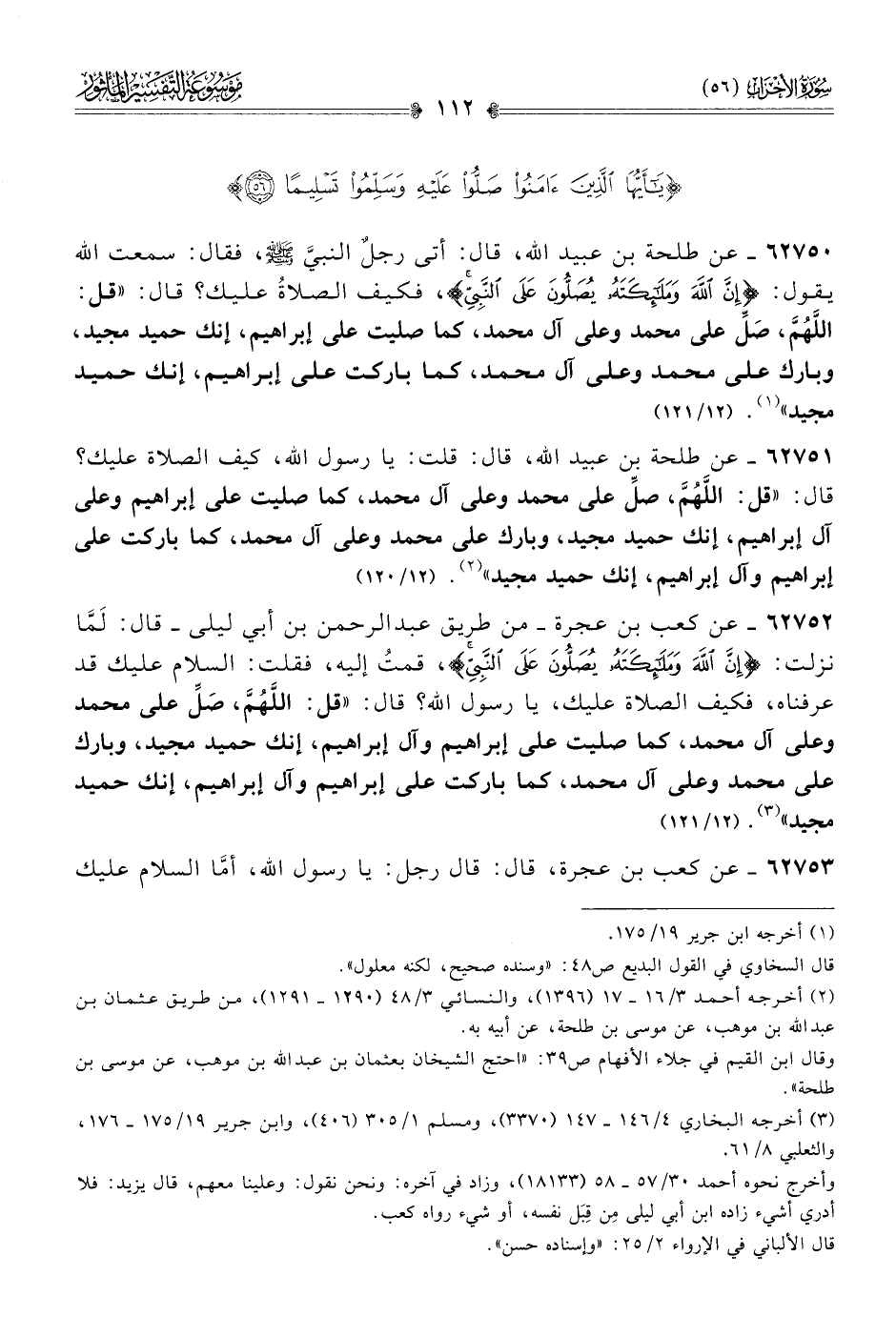 ٦٢٧٥٠ - عن طلحة بن عبيد الله، قال: أتى رجلٌ النبيَّ - صلى الله عليه وسلم -، فقال: سمعت الله يقول: {إنَّ اللَّهَ ومَلائِكَتَهُ يُصَلُّونَ عَلى النبي}، فكيف الصلاةُ عليك؟ قال: «قل: اللهم، صَلِّ على محمد وعلى آل محمد، كما صليت على إبراهيم، إنك حميد مجيد، وبارك على محمد وعلى آل محمد، كما باركت على إبراهيم، إنك حميد مجيد» (¬١). (١٢/ ١٢١)