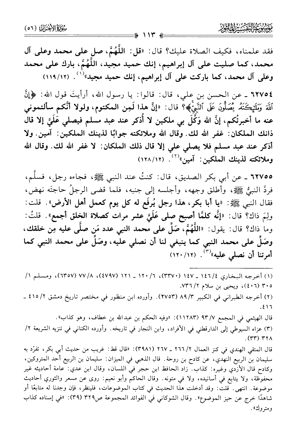 ٦٢٧٥٥ - عن أبي بكر الصديق، قال: كنتُ عند النبي - صلى الله عليه وسلم -، فجاءه رجل، فسلَّم، فردَّ النبيُّ - صلى الله عليه وسلم -، وأطلق وجهه، وأجلسه إلى جنبه، فلما قضى الرجلُ حاجتَه نهض، فقال النبي - صلى الله عليه وسلم -: «يا أبا بكر، هذا رجل يُرفَع له كل يوم كعمل أهل الأرض». قلت: ولِمَ ذاك؟ قال: «إنّه كلمّا أصبح صلى عَلَيَّ عشر مرات كصلاة الخلق أجمع». قلتُ: وما ذاك؟ قال: يقول: «اللهم، صَلِّ على محمد النبي عدد مَن صلّى عليه مِن خلقك، وصَلِّ على محمد النبي كما ينبغي لنا أن نصلي عليه، وصَلِّ على محمد النبي كما أمرتنا أن نصلي عليه» (¬٣). (١٢/ ١٢٠)