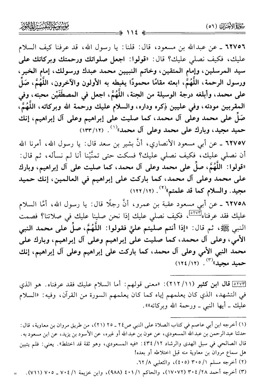 ٦٢٧٥٧ - عن أبي مسعود الأنصاري، أنّ بشير بن سعد قال: يا رسول الله، أمرنا الله أن نصلي عليك، فكيف نصلي عليك؟ فسكت حتى تمنَّيْنا أنا لم نسأله، ثم قال: «قولوا: اللهم، صلِّ على محمد وعلى آل محمد، كما صليت على آل إبراهيم، وبارك على محمد وعلى آل محمد، كما باركت على إبراهيم في العالمين، إنك حميد مجيد. والسلام كما قد علمتم» (¬٢). (١٢/ ١٢٢)