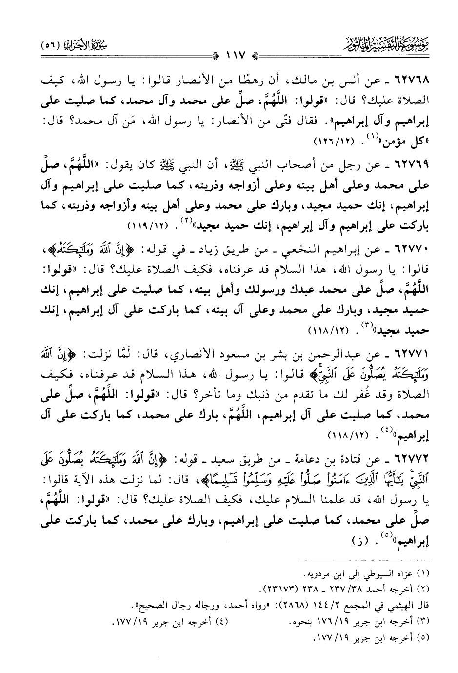 ٦٢٧٧٠ - عن إبراهيم النخعي -من طريق زياد- في قوله: {إنَّ اللَّهَ ومَلائِكَتَهُ}، قالوا: يا رسول الله، هذا السلام قد عرفناه، فكيف الصلاة عليك؟ قال: «قولوا: اللهم، صلِّ على محمد عبدك ورسولك وأهل بيته، كما صليت على إبراهيم، إنك حميد مجيد، وبارك على محمد وعلى آل بيته، كما باركت على آل إبراهيم، إنك حميد مجيد» (¬٣). (١٢/ ١١٨)