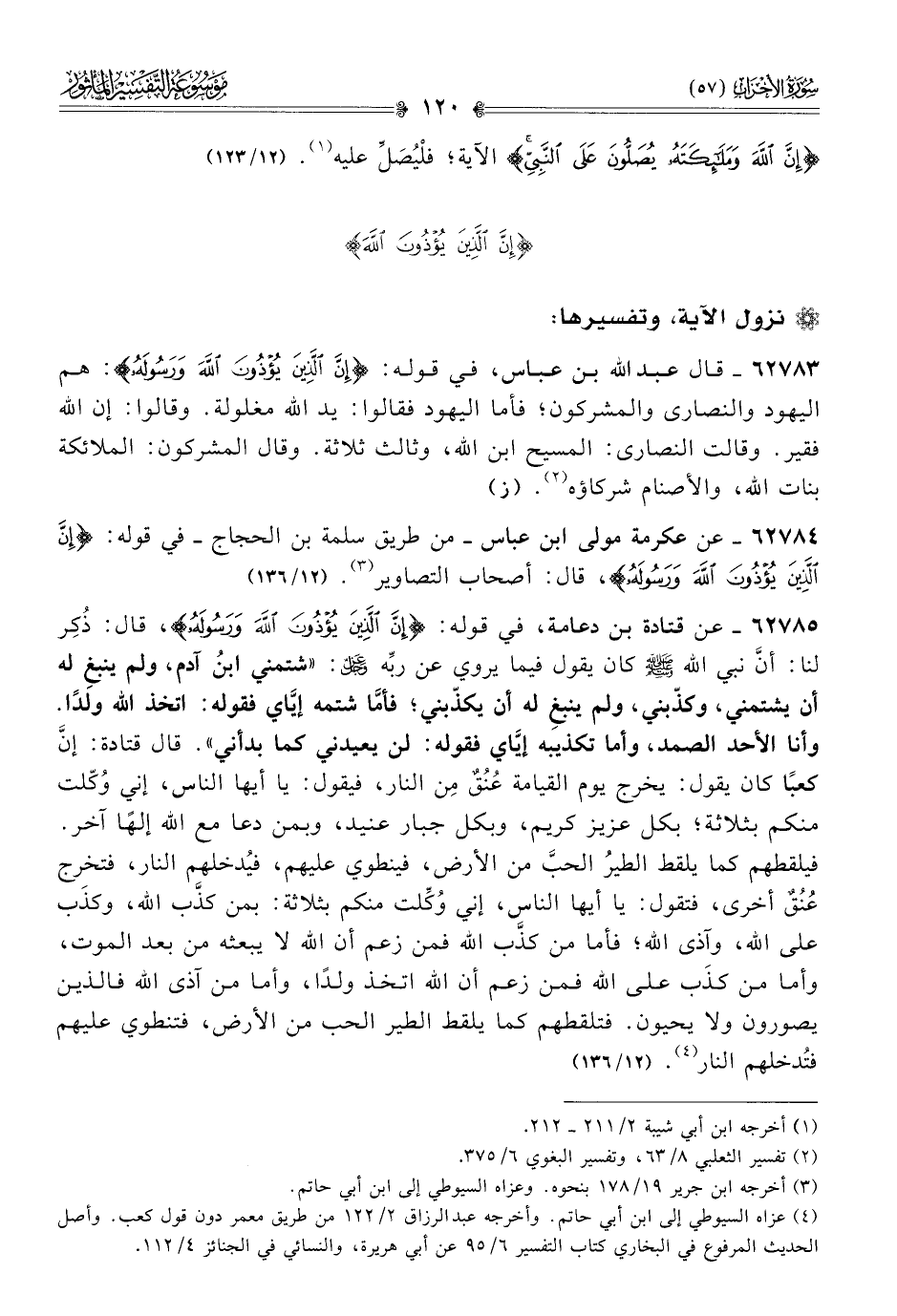 ٦٢٧٨٤ - عن عكرمة مولى ابن عباس -من طريق سلمة بن الحجاج- في قوله: {إنَّ الَّذِينَ يُؤْذُونَ اللَّهَ ورَسُولَهُ}، قال: أصحاب التصاوير (¬٣). (١٢/ ١٣٦)