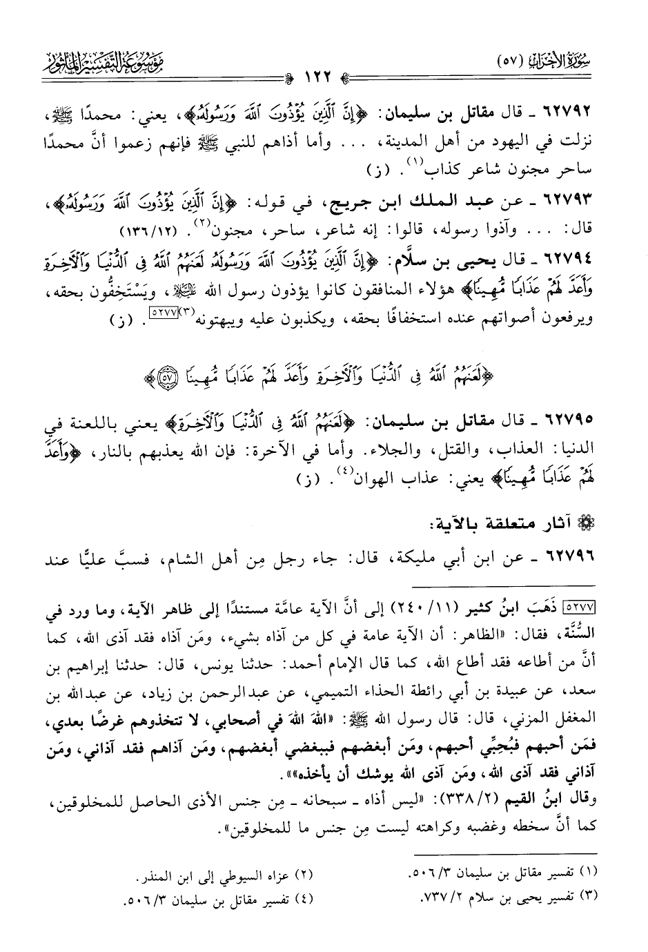 ٦٢٧٩٢ - قال مقاتل بن سليمان: {إنَّ الَّذِينَ يُؤْذُونَ اللَّهَ ورَسُولَهُ}، يعني: محمدًا - صلى الله عليه وسلم -، نزلت في اليهود من أهل المدينة، ... وأما أذاهم للنبي - صلى الله عليه وسلم - فإنهم زعموا أنّ محمدًا ساحر مجنون شاعر كذاب (¬١). (ز)