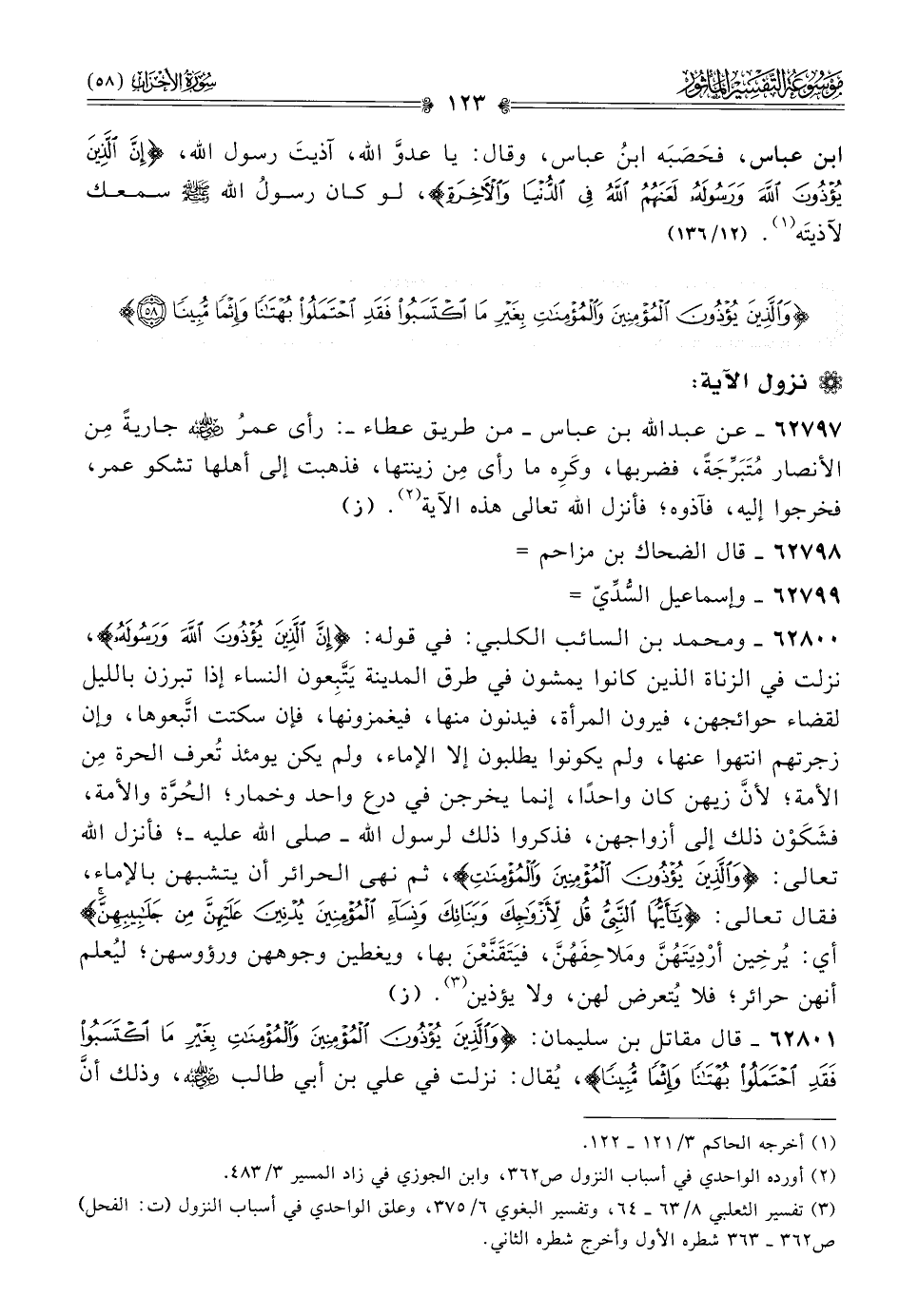 ٦٢٨٠٠ - ومحمد بن السائب الكلبي: في قوله: {إنَّ الَّذِينَ يُؤْذُونَ اللَّهَ ورَسُولَهُ}، نزلت في الزناة الذين كانوا يمشون في طرق المدينة يَتَّبِعون النساء إذا تبرزن بالليل لقضاء حوائجهن، فيرون المرأة، فيدنون منها، فيغمزونها، فإن سكتت اتَّبعوها، وإن زجرتهم انتهوا عنها، ولم يكونوا يطلبون إلا الإماء، ولم يكن يومئذ تُعرف الحرة مِن الأمة؛ لأنّ زيهن كان واحدًا، إنما يخرجن في درع واحد وخمار؛ الحُرَّة والأمة، فشَكَوْن ذلك إلى أزواجهن، فذكروا ذلك لرسول الله -صلى الله عليه-؛ فأنزل الله تعالى: {والَّذِينَ يُؤْذُونَ المُؤْمِنِينَ والمُؤْمِناتِ}، ثم نهى الحرائر أن يتشبهن بالإماء، فقال تعالى: {يا أيُّها النبي قُلْ لِأَزْواجِكَ وبَناتِكَ ونِساءِ المُؤْمِنِينَ يُدْنِينَ عَلَيْهِنَّ مِن جَلابِيبِهِنَّ} أي: يُرخِين أرْدِيَتَهُنَّ ومَلاحِفَهُنَّ، فيَتَقَنَّعْنَ بها، ويغطين وجوههن ورؤوسهن؛ ليُعلم أنهن حرائر؛ فلا يُتعرض لهن، ولا يؤذين (¬٣). (ز)