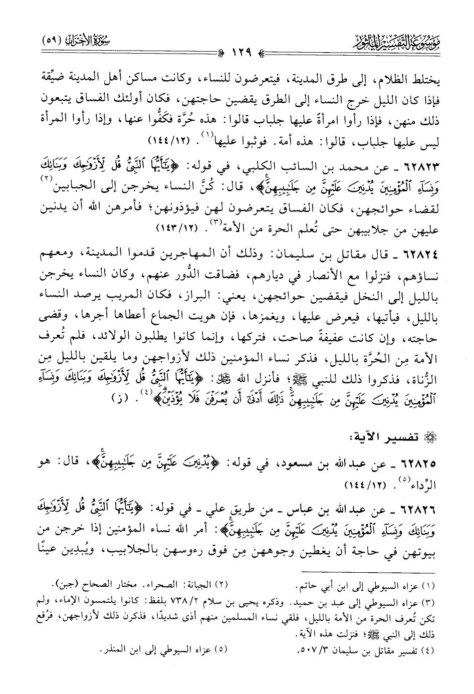 ٦٢٨٢٣ - عن محمد بن السائب الكلبي، في قوله: {يا أيُّها النبي قُلْ لِأَزْواجِكَ وبَناتِكَ ونِساءِ المُؤْمِنِينَ يُدْنِينَ عَلَيْهِنَّ مِن جَلابِيبِهِنَّ}، قال: كُنَّ النساء يخرجن إلى الجبابين (¬٢) لقضاء حوائجهن، فكان الفساق يتعرضون لهن فيؤذونهن؛ فأمرهن الله أن يدنين عليهن من جلابيبهن حتى تُعلم الحرة من الأمة (¬٣). (١٢/ ١٤٣)