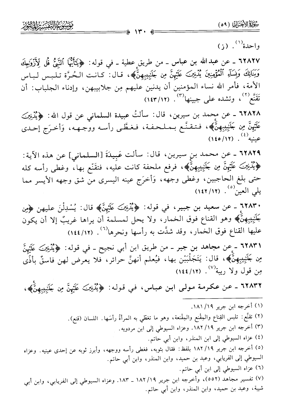 ٦٢٨٢٩ - عن محمد بن سيرين، قال: سألت عَبِيدَةَ [السلماني] عن هذه الآية: {يُدْنِينَ عَلَيْهِنَّ مِن جَلابِيبِهِنَّ}، فرفع ملحفة كانت عليه، فتقَنّع بها، وغطى رأسه كله حتى بلغ الحاجبين، وغطى وجهه، وأخرَج عينه اليسرى من شق وجهه الأيسر مما يلي العين (¬٥). (١٢/ ١٤٢)