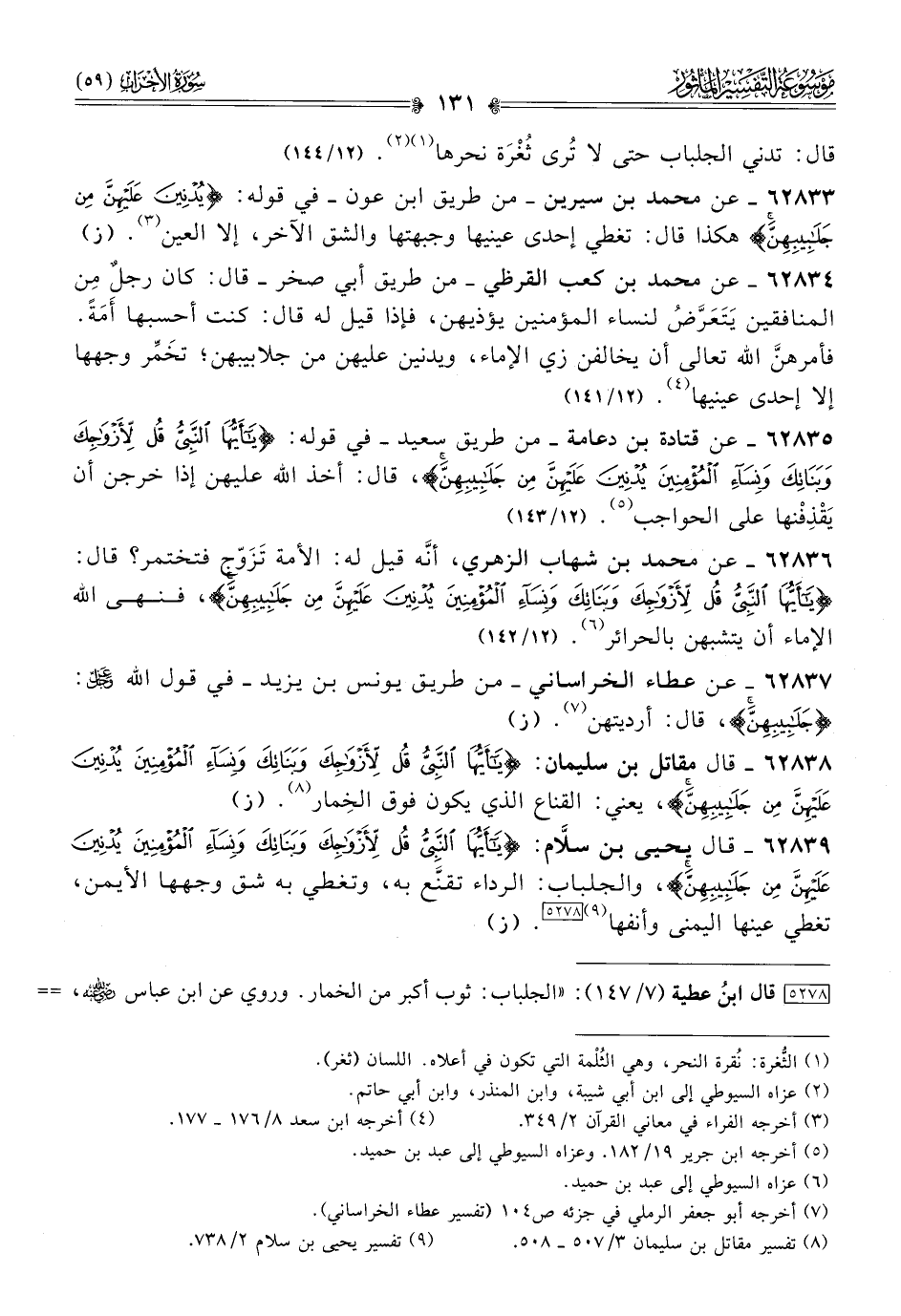 ٦٢٨٣٥ - عن قتادة بن دعامة -من طريق سعيد- في قوله: {يا أيُّها النبي قُلْ لِأَزْواجِكَ وبَناتِكَ ونِساءِ المُؤْمِنِينَ يُدْنِينَ عَلَيْهِنَّ مِن جَلابِيبِهِنَّ}، قال: أخذ الله عليهن إذا خرجن أن يَقْذِفْنها على الحواجب (¬٥). (١٢/ ١٤٣)