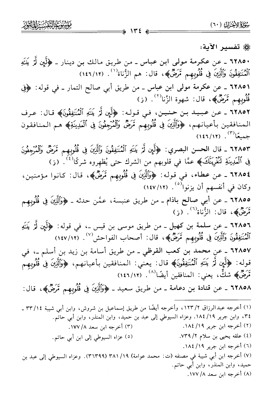 ٦٢٨٥٠ - عن عكرمة مولى ابن عباس -من طريق مالك بن دينار- {لَئِنْ لَمْ يَنْتَهِ المُنافِقُونَ والَّذِينَ فِي قُلُوبِهِمْ مَرَضٌ}، قال: هم الزُّناة (¬١). (١٢/ ١٤٦)