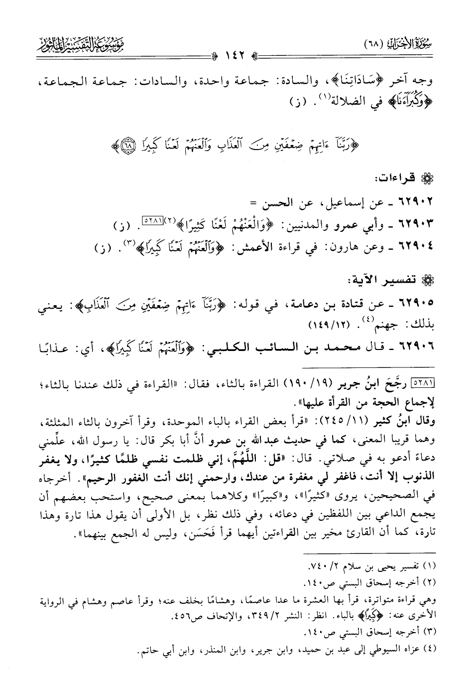 ٦٢٩٠٦ - قال محمد بن السائب الكلبي: {والعَنْهُمْ لَعْنًا كَبِيرًا}، أي: عذابًا