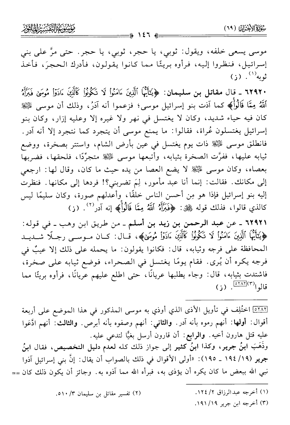 ٦٢٩٢١ - عن عبد الرحمن بن زيد بن أسلم -من طريق ابن وهب- في قوله: {يا أيُّها الَّذِينَ آمَنُوا لا تَكُونُوا كالَّذِينَ آذَوْا مُوسى}، قال: كان موسى رجلًا شديد المحافظة على فرجه وثيابه، قال: فكانوا يقولون: ما يحمله على ذلك إلا عيبٌ في فرجه يكره أن يُرى. فقام يومًا يغتسل في الصحراء، فوضع ثيابه على صخرة، فاشتدت بثيابه، قال: وجاء يطلبها عريانًا، حتى اطلع عليهم عريانًا، فرأوه بريئًا مما قالوا (¬٣) [٥٢٨٢]. (ز)