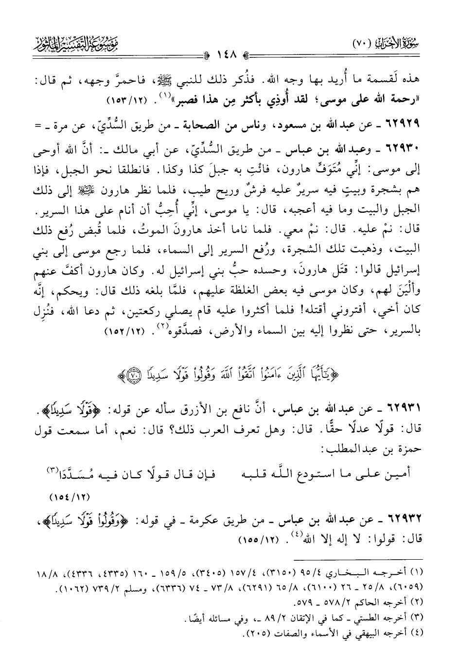 ٦٢٩٣١ - عن عبد الله بن عباس، أنّ نافع بن الأزرق سأله عن قوله: {قَوْلًا سَدِيدًا}. قال: قولًا عدلًا حقًّا. قال: وهل تعرف العرب ذلك؟ قال: نعم، أما سمعت قول حمزة بن عبد المطلب: