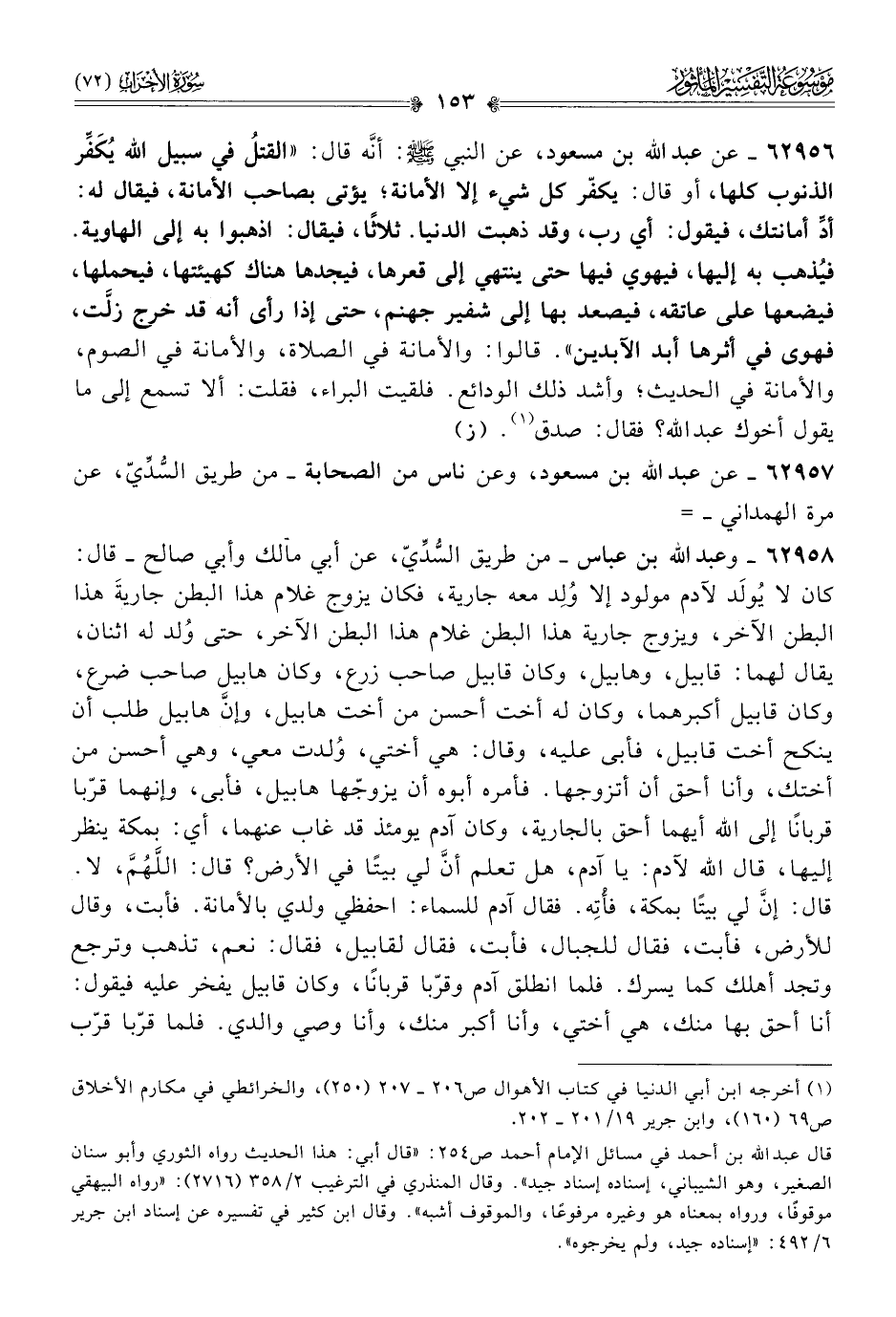 ٦٢٩٥٦ - عن عبد الله بن مسعود، عن النبي - صلى الله عليه وسلم - أنّه قال: «القتلُ في سبيل الله يُكَفِّر الذنوب كلها، أو قال: يكفّر كل شيء إلا الأمانة؛ يؤتى بصاحب الأمانة، فيقال له: أدِّ أمانتك، فيقول: أي رب، وقد ذهبت الدنيا. ثلاثًا، فيقال: اذهبوا به إلى الهاوية. فيُذهب به إليها، فيهوي فيها حتى ينتهي إلى قعرها، فيجدها هناك كهيئتها، فيحملها، فيضعها على عاتقه، فيصعد بها إلى شفير جهنم، حتى إذا رأى أنه قد خرج زلَّت، فهوى في أثرها أبد الآبدين». قالوا: والأمانة في الصلاة، والأمانة في الصوم، والأمانة في الحديث؛ وأشد ذلك الودائع. فلقيت البراء، فقلت: ألا تسمع إلى ما يقول أخوك عبد الله؟ فقال: صدق (¬١). (ز)