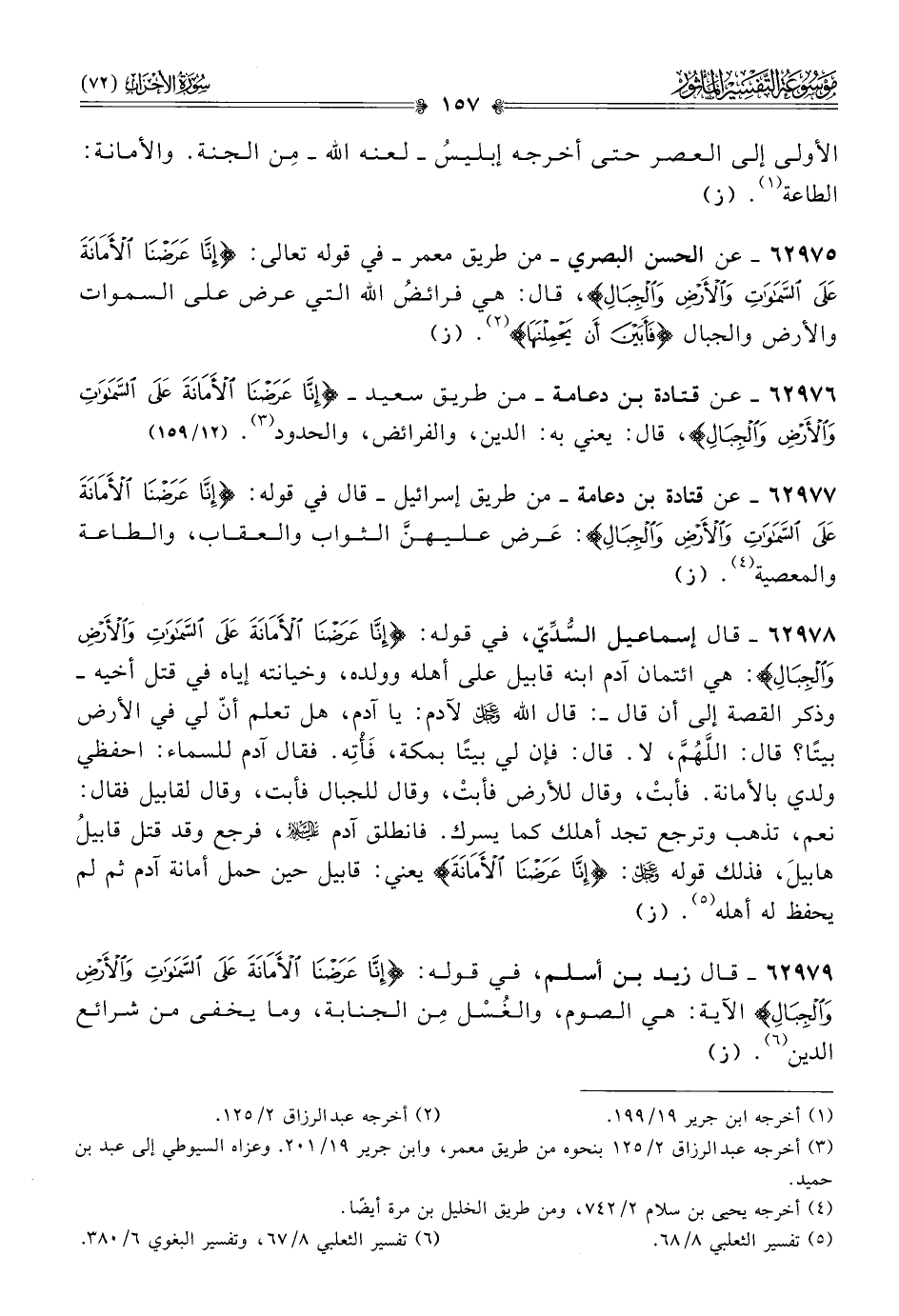 ٦٢٩٧٦ - عن قتادة بن دعامة -من طريق سعيد- {إنّا عَرَضْنا الأَمانَةَ عَلى السَّماواتِ والأَرْضِ والجِبالِ}، قال: يعني به: الدين، والفرائض، والحدود (¬٣). (١٢/ ١٥٩)