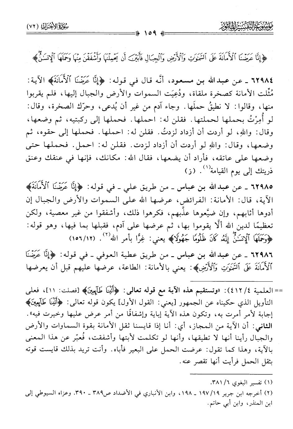 ٦٢٩٨٦ - عن عبد الله بن عباس -من طريق عطية العوفي- في قوله: {إنّا عَرَضْنا الأَمانَةَ عَلى السَّمَواتِ والأَرْضِ}: يعني بالأمانة: الطاعة، عرضها عليهم قبل أن يعرضها