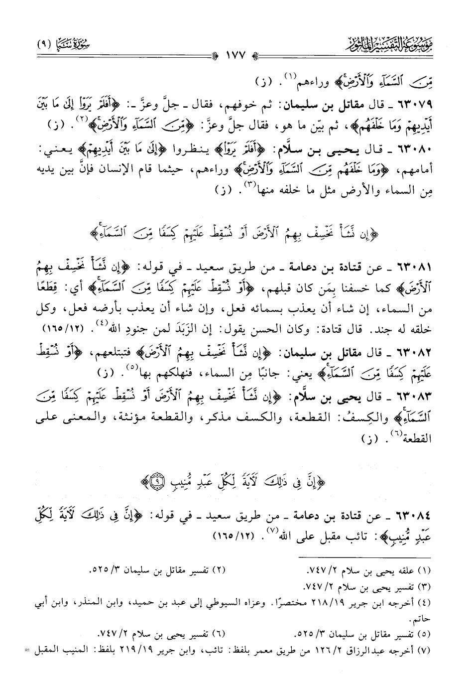 ٦٣٠٨٠ - قال يحيى بن سلّام: {أفَلَمْ يَرَوْا} ينظروا {إلى ما بَيْنَ أيْدِيهِمْ} يعني: أمامهم، {وما خَلْفَهُمْ مِنَ السَّماءِ والأَرْضِ} وراءهم، حيثما قام الإنسان فإنّ بين يديه مِن السماء والأرض مثل ما خلفه منها (¬٣). (ز)