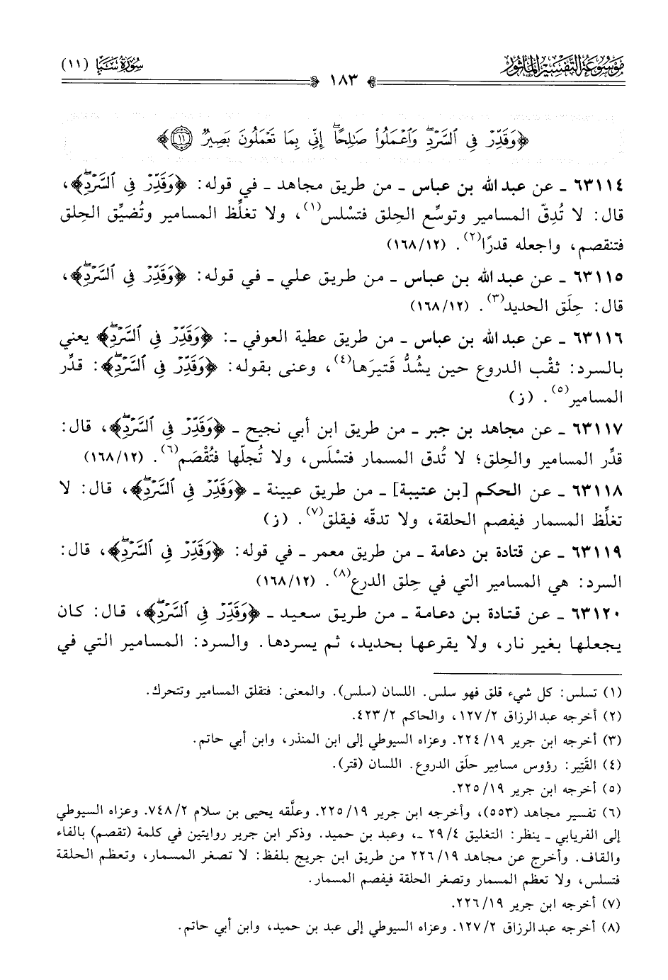 ٦٣١١٥ - عن عبد الله بن عباس -من طريق علي- في قوله: {وقَدِّرْ فِي السَّرْدِ}، قال: حِلَق الحديد (¬٣). (١٢/ ١٦٨)
