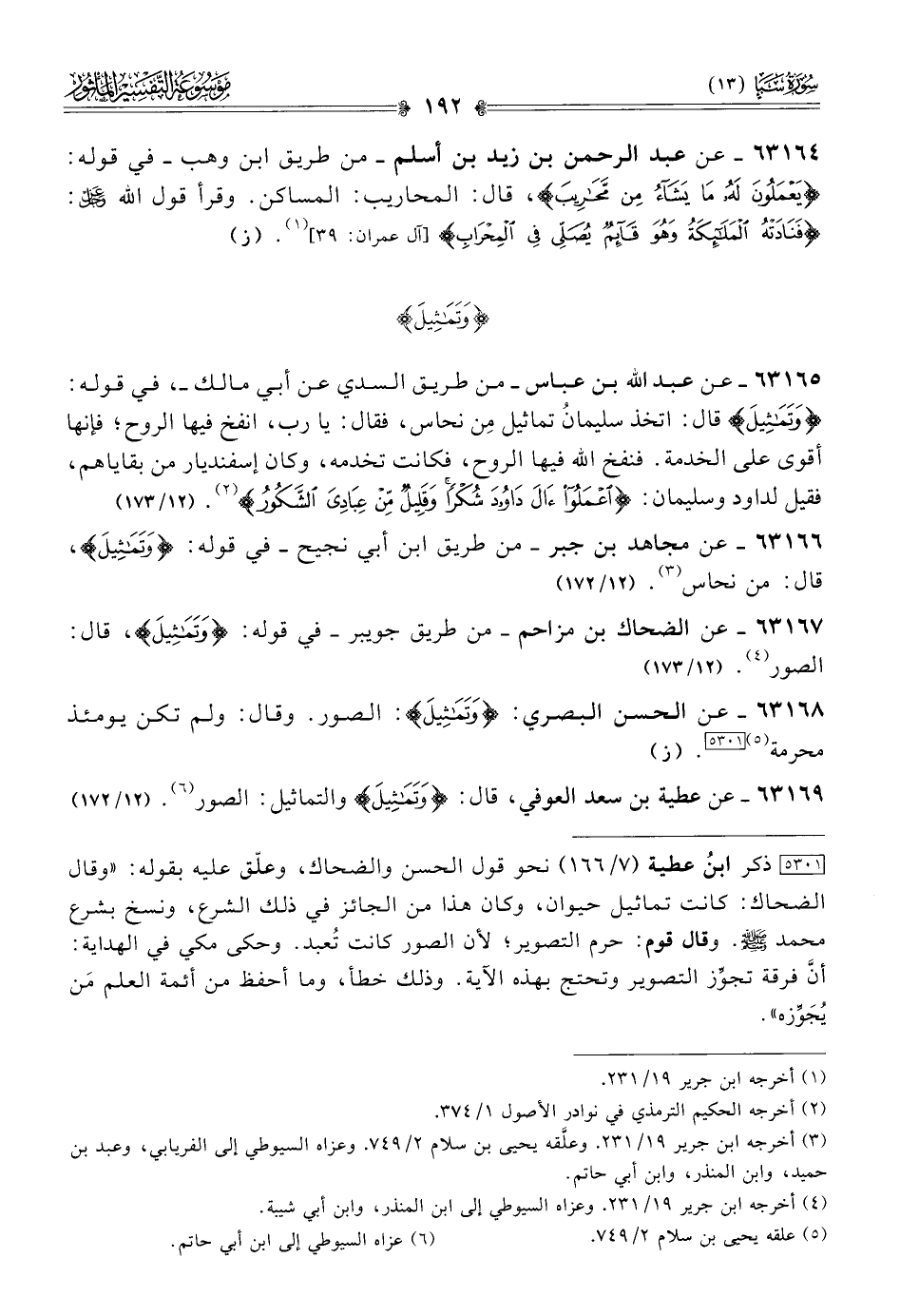 ٦٣١٦٩ - عن عطية بن سعد العوفي، قال: {وتَماثِيلَ} والتماثيل: الصور (¬٦). (١٢/ ١٧٢)