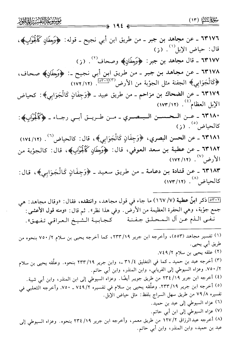 ٦٣١٧٨ - عن مجاهد بن جبر -من طريق ابن أبي نجيح-: {وجِفانٍ} صحاف، «كالجَوابِي» الجفنة مثل الجوْبة من الأرض (¬٣) [٥٣٠٢]. (١٢/ ١٧٢)