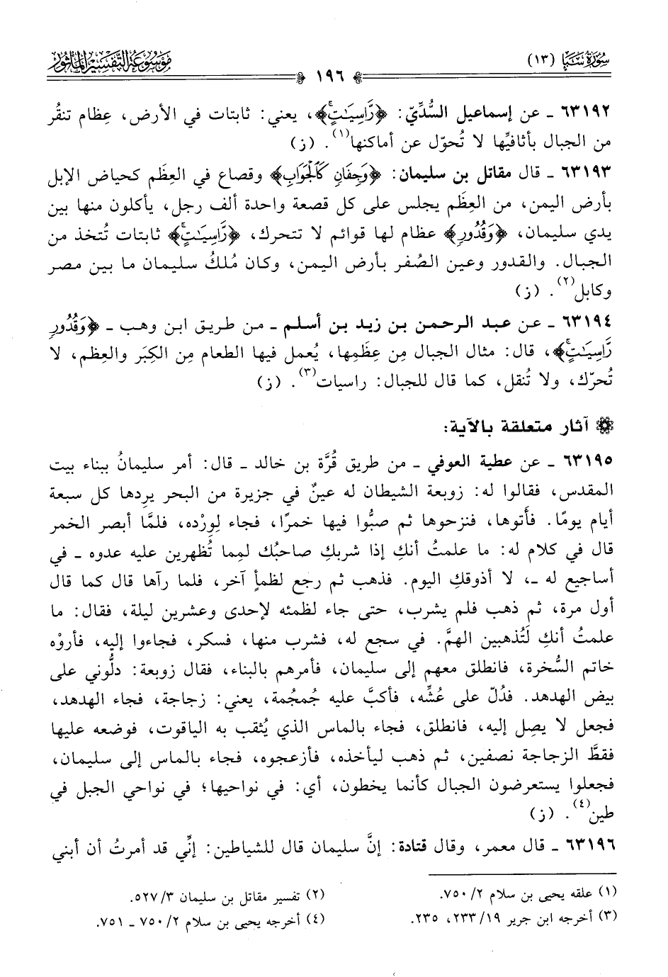 ٦٣١٩٤ - عن عبد الرحمن بن زيد بن أسلم -من طريق ابن وهب- {وقُدُورٍ راسِياتٍ}، قال: مثال الجبال مِن عِظَمِها، يُعمل فيها الطعام مِن الكِبَر والعِظم، لا تُحرّك، ولا تُنقل، كما قال للجبال: راسيات (¬٣). (ز)