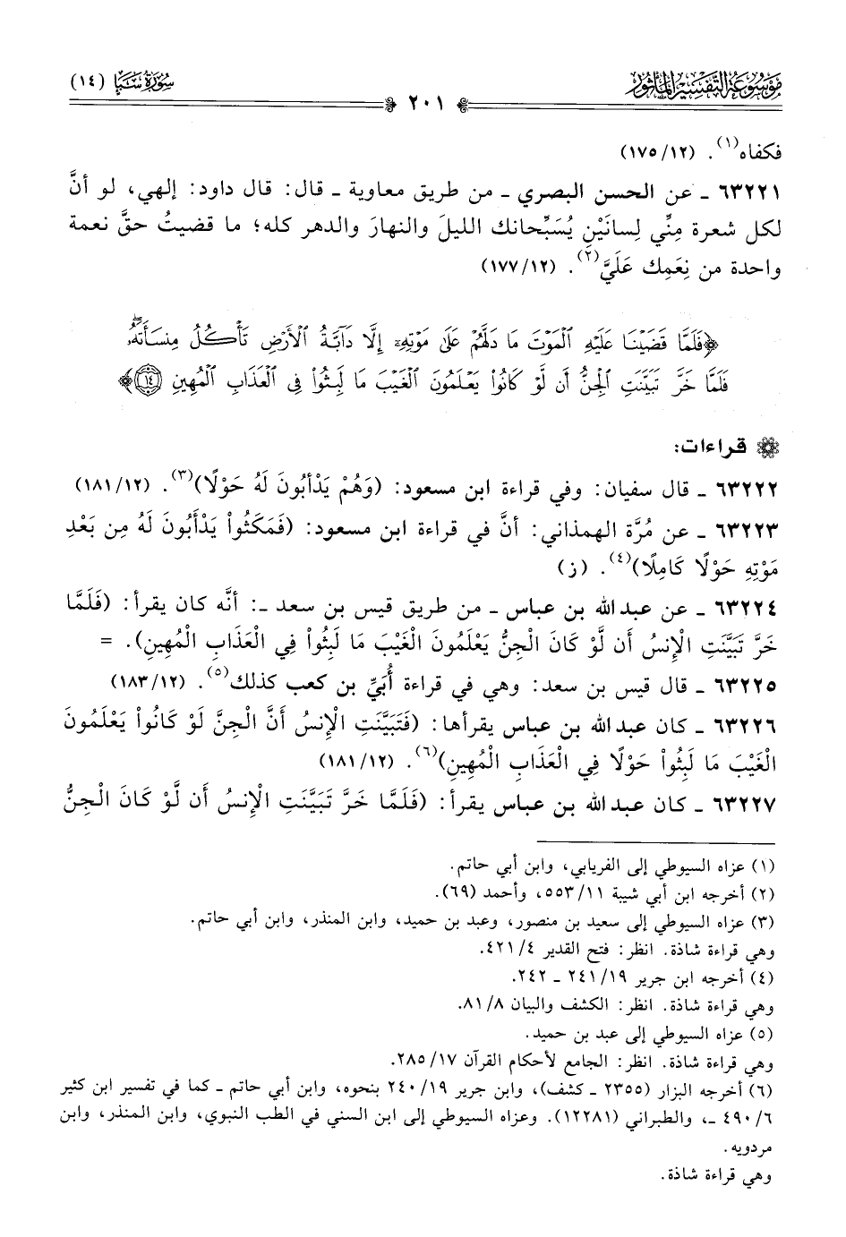 ٦٣٢٢٧ - كان عبد الله بن عباس يقرأ: (فَلَمّا خَرَّ تَبَيَّنَتِ الإنسُ أن لَّوْ كانَ الجِنُّ