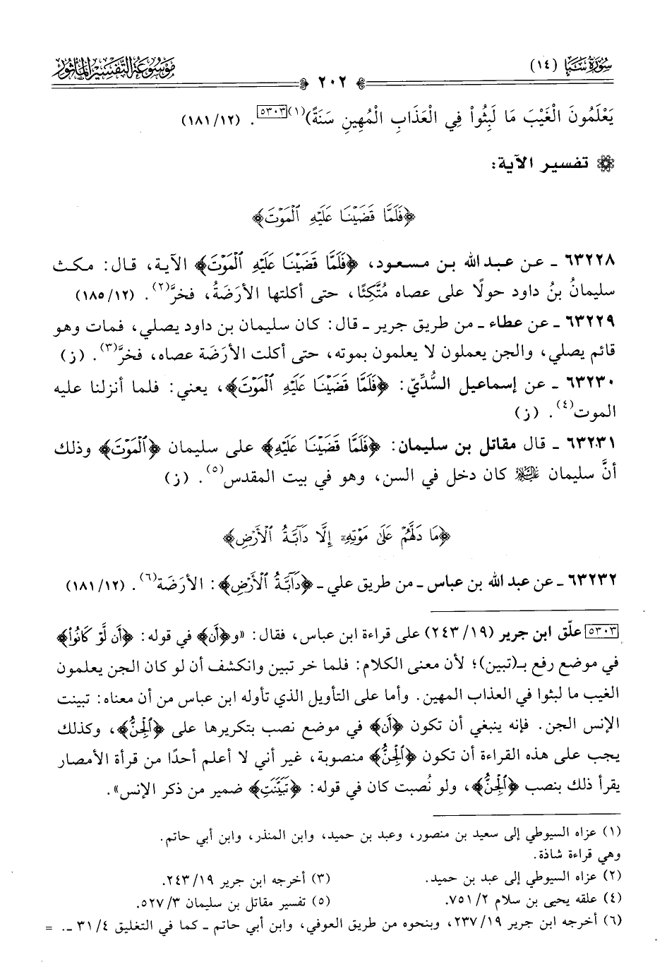 ٦٣٢٣١ - قال مقاتل بن سليمان: {فَلَمّا قَضَيْنا عَلَيْهِ} على سليمان {المَوْتَ} وذلك أنّ سليمان - عليه السلام - كان دخل في السن، وهو في بيت المقدس (¬٥). (ز)