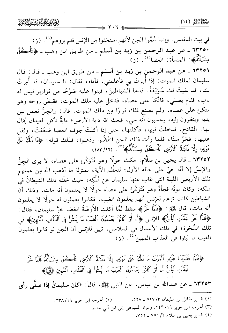 ٦٣٢٥١ - عن عبد الرحمن بن زيد بن أسلم -من طريق ابن وهب- قال: قال سليمان لملك الموت: إذا أُمِرتَ بي فأعلِمني. فأتاه، فقال: يا سليمان، قد أُمِرتُ بك، قد بقيتْ لك سُوَيْعَةٌ. فدعا الشياطينَ، فبنوا عليه صَرْحًا مِن قوارير ليس له باب، فقام يصلي، فاتَّكأ على عصاه، فدخل عليه ملك الموت، فقبضَ روحه وهو متكئ على عصاه، ولم يصنع ذلك فرارًا مِن ملَك الموت. قال: والجِنُّ تعمل بين يديه وينظرون إليه، يحسبون أنه حي، فبعث الله دابة الأرض؛ دابةٌ تأكل العيدان يُقال لها: القادح. فدخلتْ فيها، فأكلتها، حتى إذا أكلتْ جوف العصا ضعُفتْ، وثقل عليها، فخرّ ميتًا، فلما رأت ذلك الجن انفَضُّوا وذهبوا، فذلك قوله: {ما دَلَّهُمْ عَلى مَوْتِهِ إلّا دابَّةُ الأَرْضِ تَأْكُلُ مِنسَأَتَهُ} (¬٣). (١٢/ ١٨٣)