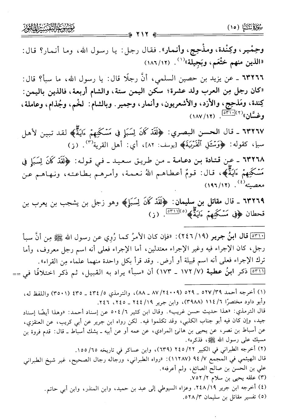 [٥٣١٠] قال ابنُ جرير (١٩/ ٢٤٦): «فإن كان الأمرُ كما رُوِي عن رسول الله - صلى الله عليه وسلم - مِن أنّ سبأ رجل، كان الإجراء فيه وغير الإجراء معتدلين، أما الإجراء فعلى أنه اسم رجل معروف، وأما ترك الإجراء فعلى أنه اسم قبيلة أو أرض. وقد قرأ بكل واحدة منهما علماء مِن القراء».